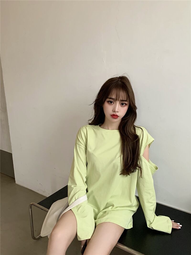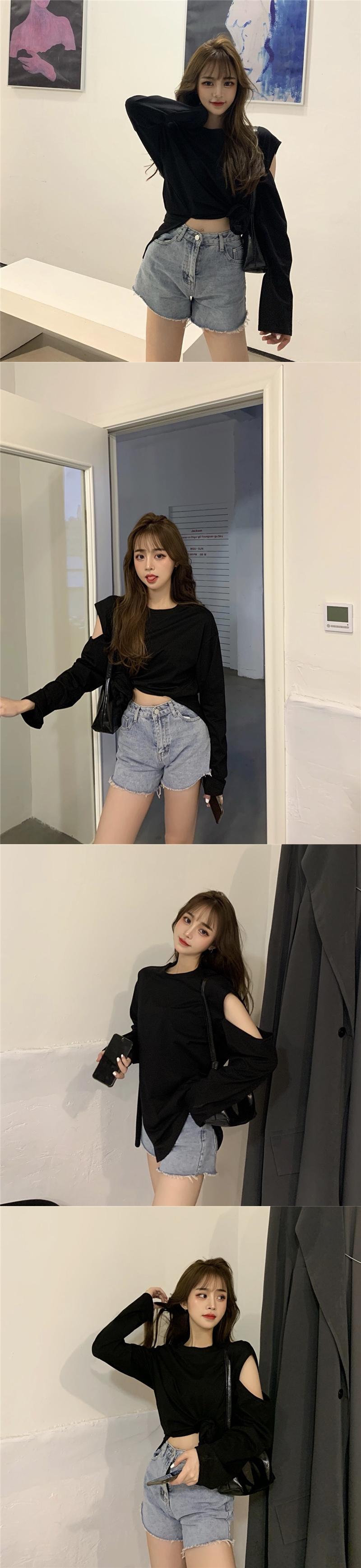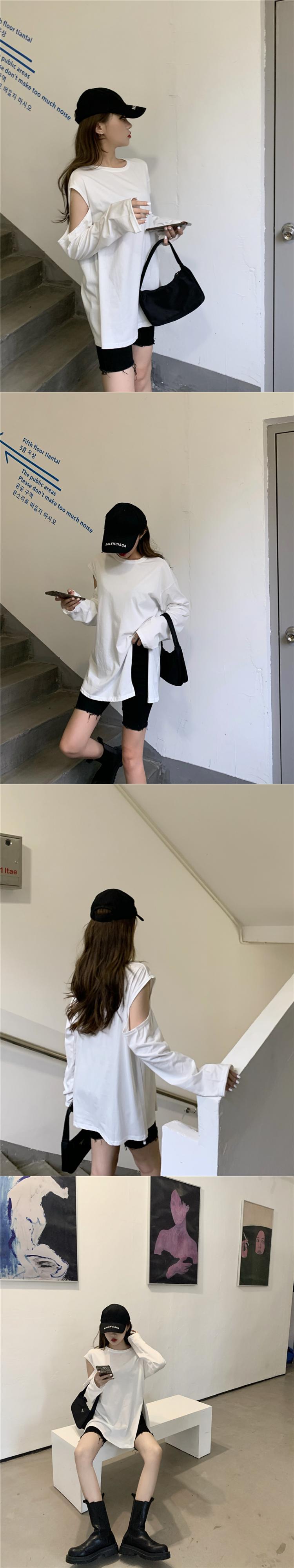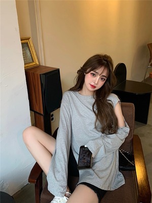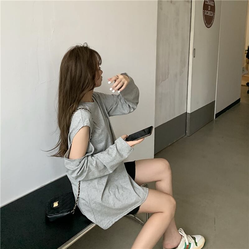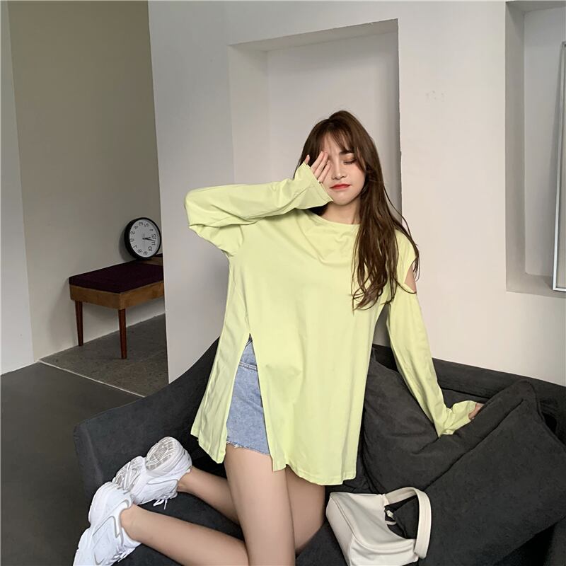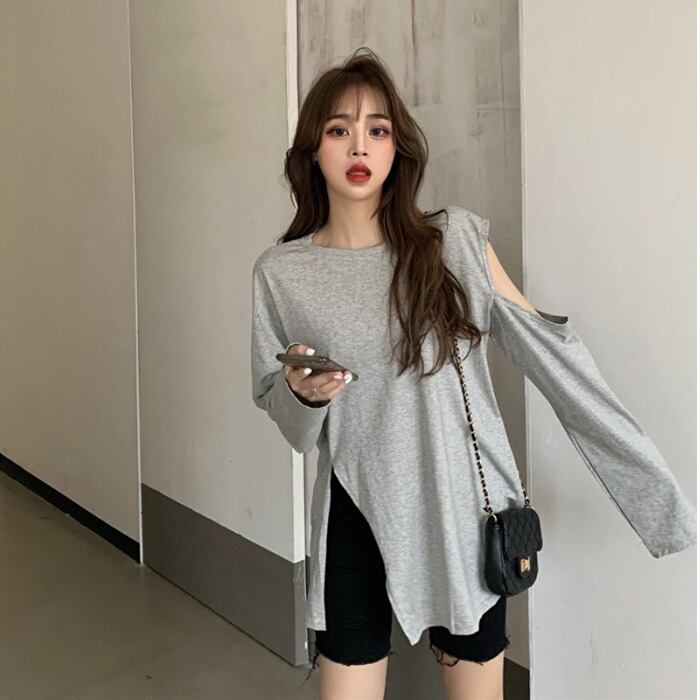 ネットレッドスプリットスキームストラップレスイレギュラーTシャツ女性秋バージョンルーズで薄い長袖ボトミングシャツトップ クレセントシティ2346285555