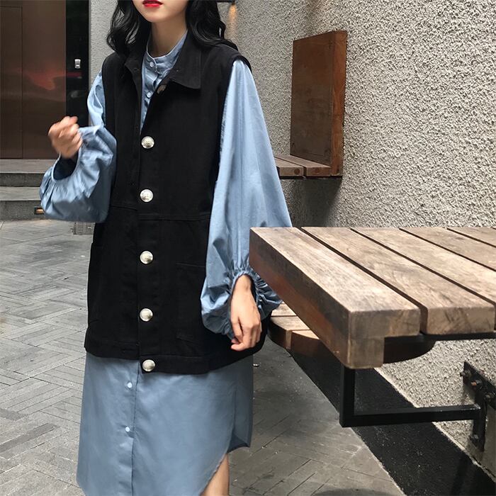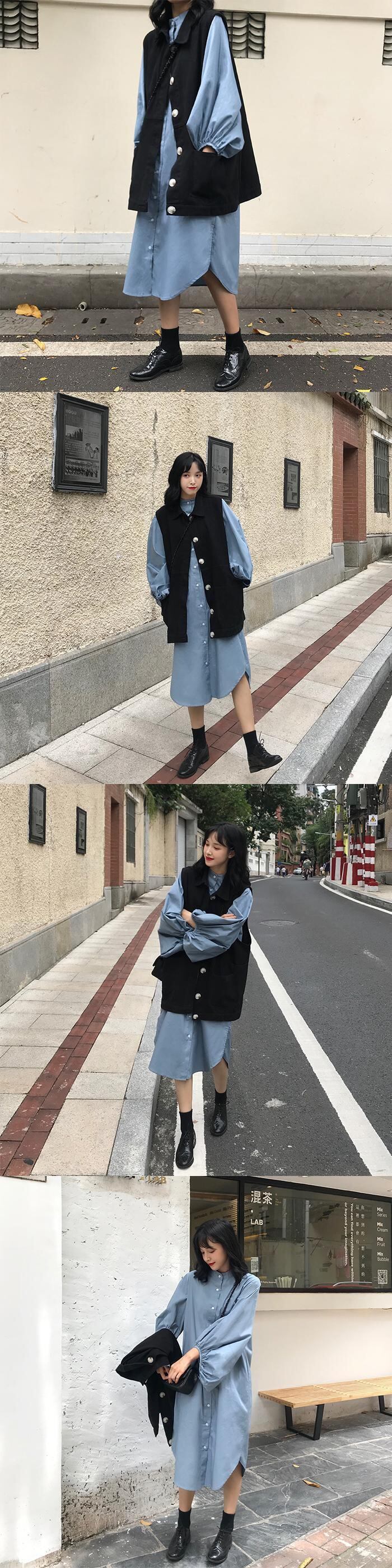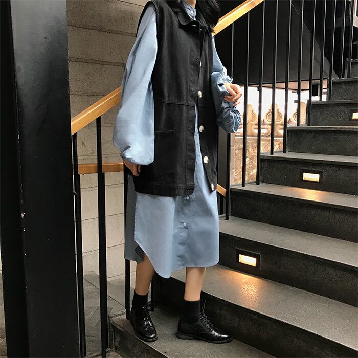 ドレスウィメンズ2020ニューバージョンのオータムブルールーズミドル丈シャツスカート+ブラックシングルブレストベスト クレセントシティ31281182035