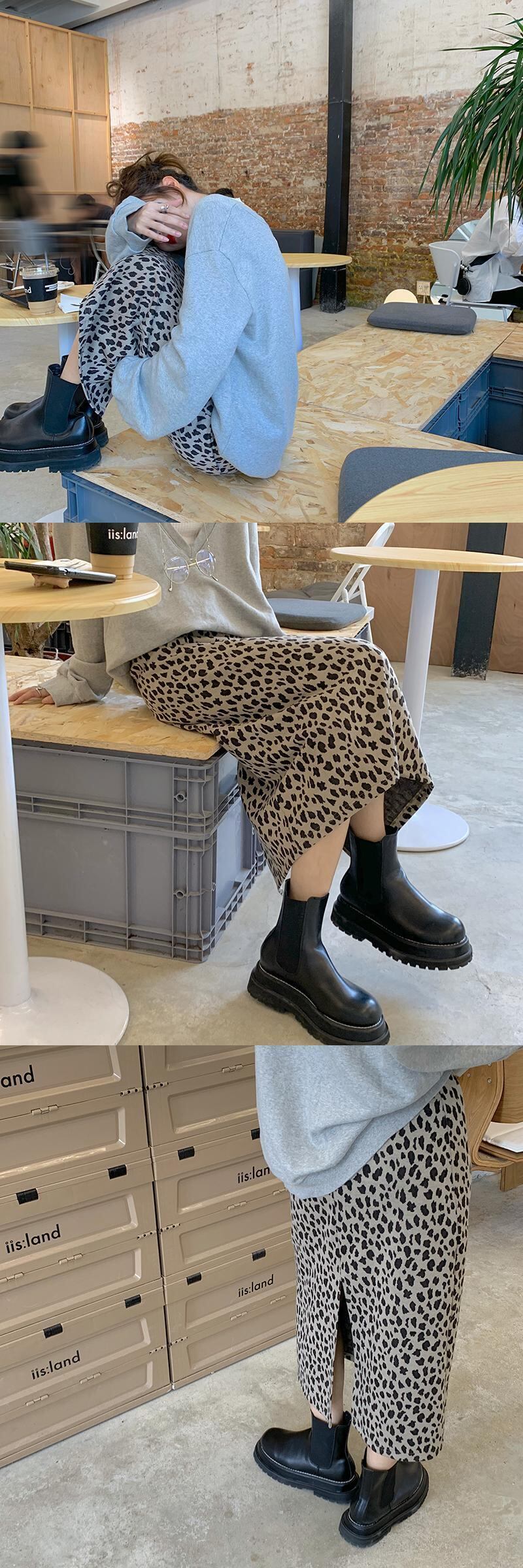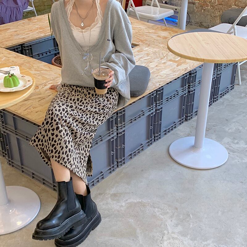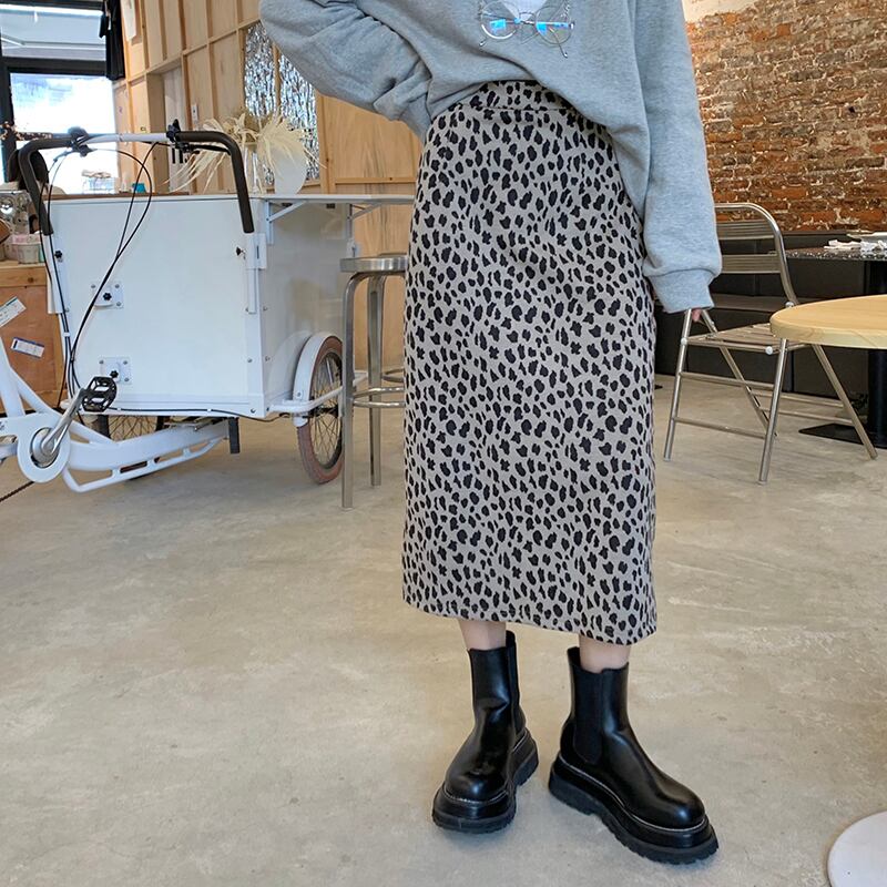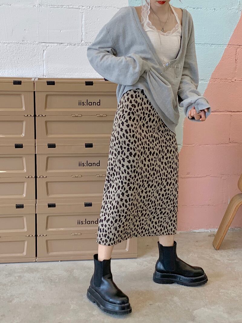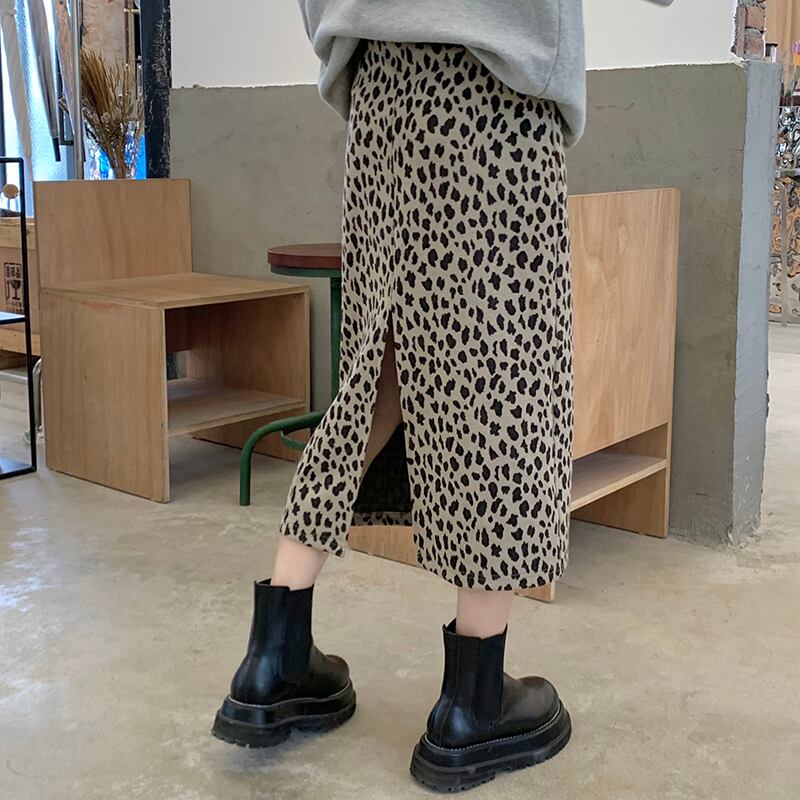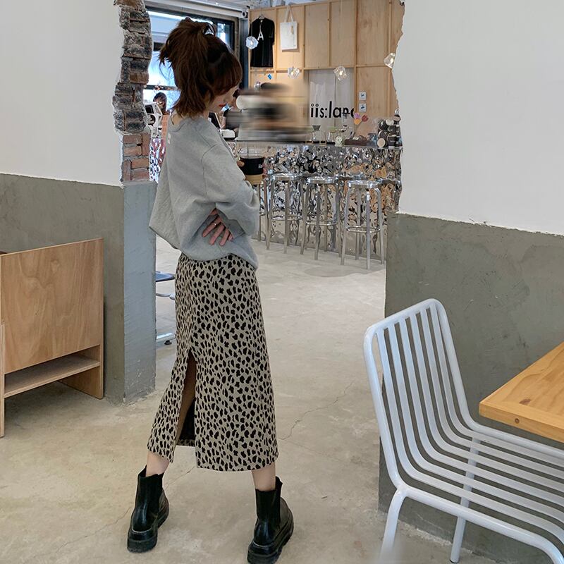 ヒョウ柄スカート女性の2020年秋スタイルウエストスリムスプリットミドル丈スカート+ルーズVネックグレーセーター クレセントシティ56261772437