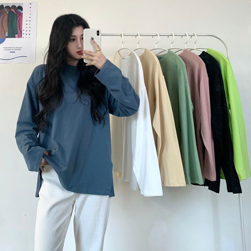 ピュアカラー長袖Tシャツレディース2020新バージョン秋ロングラウンドネックルーズカジュアルスプリットボトミングシャツイン クレセントシティ70023626356