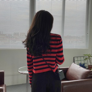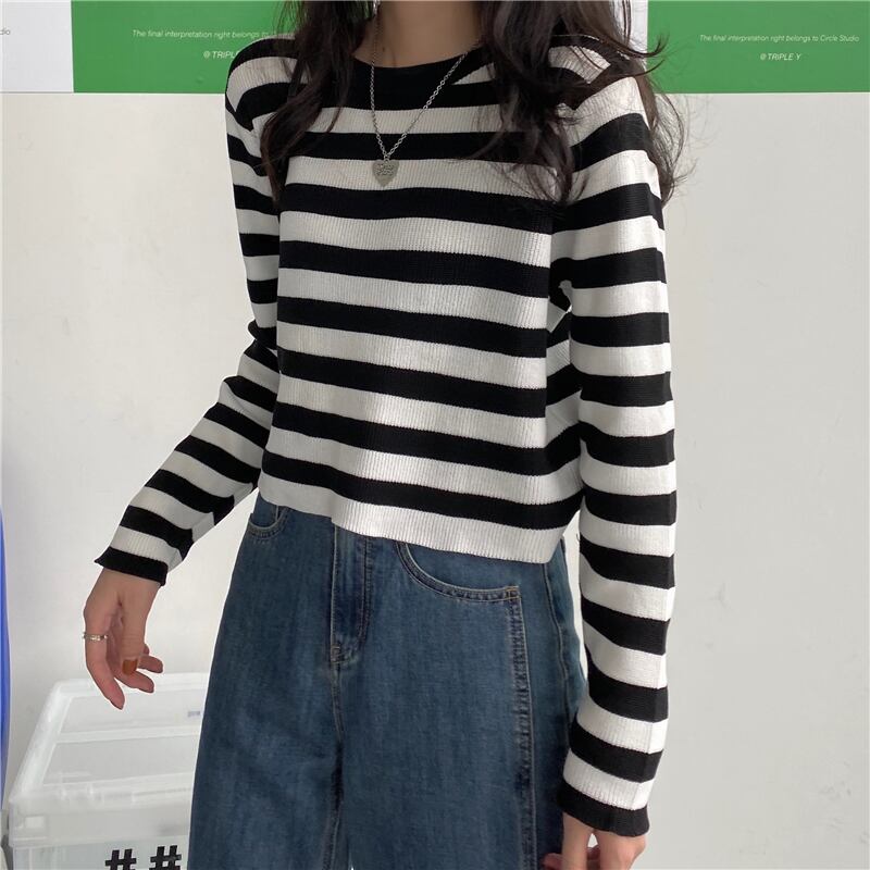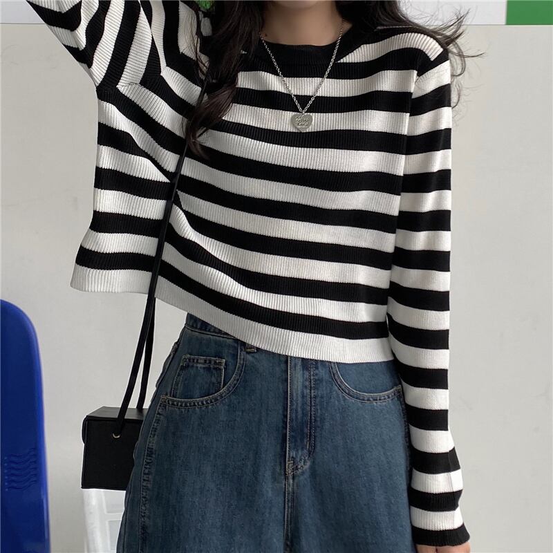 オータムスタイルルーズストライプセーター ショートクロップトップ トップス ロング 秋物 クレセントシティ21926313092