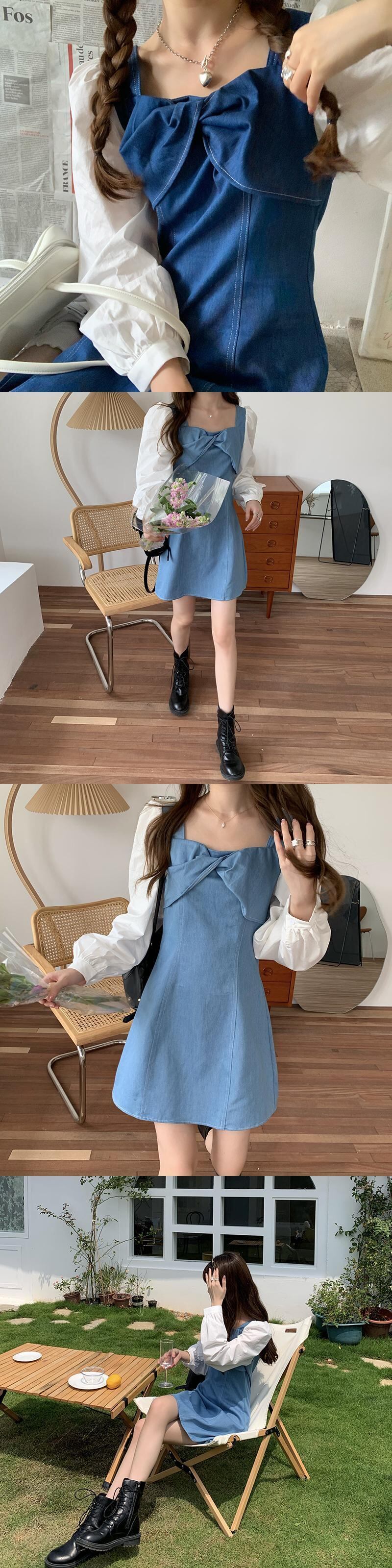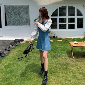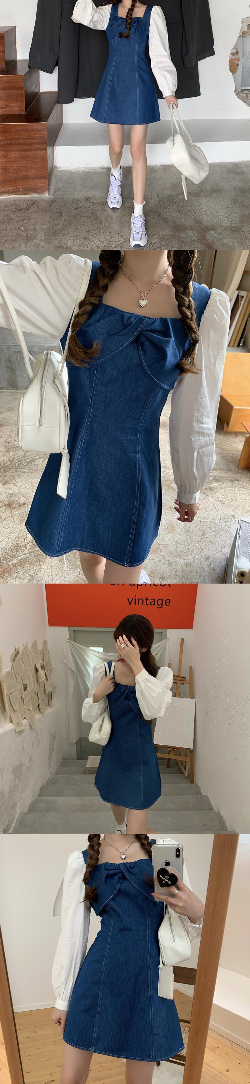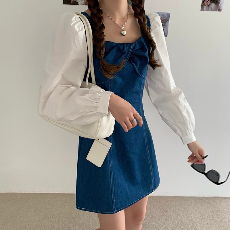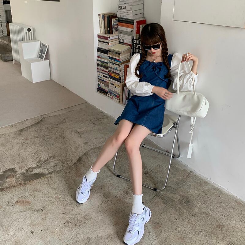 デニムスカートレディース2020年初秋新作ハイウエストデザインセンススプライシングスリーブ気質スクエアネックパフスリーブワンピース クレセントシティ96690867540