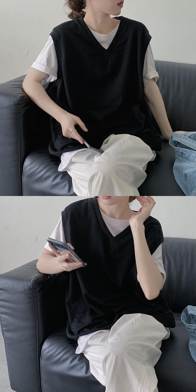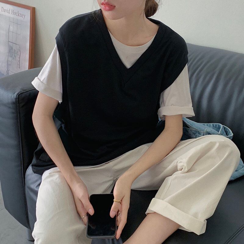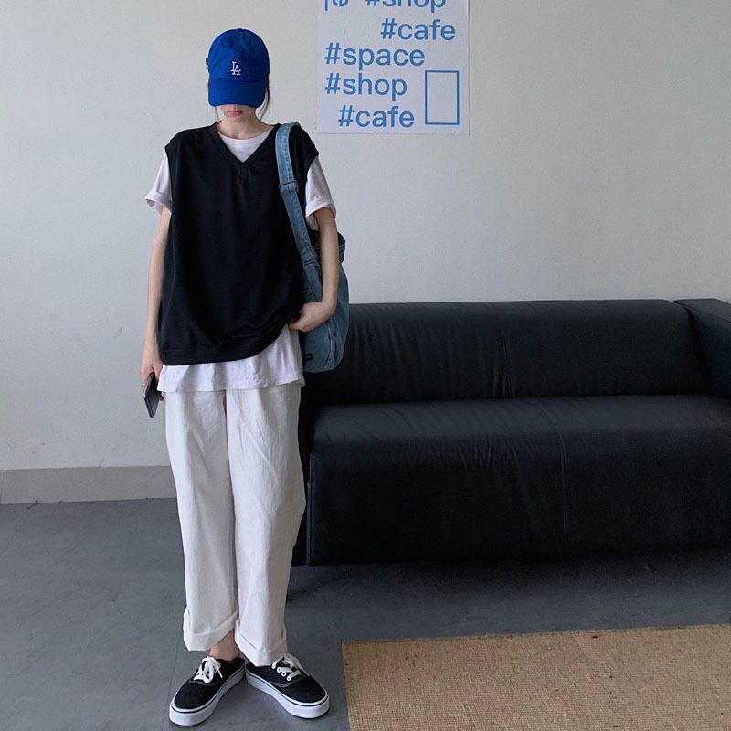 2020年初秋新しいカジュアルスーツの女性用Vネックブラックベスト+ハイウエストルーズルックの薄くて小さいワイドレッグパンツ クレセントシティ75618676616