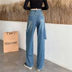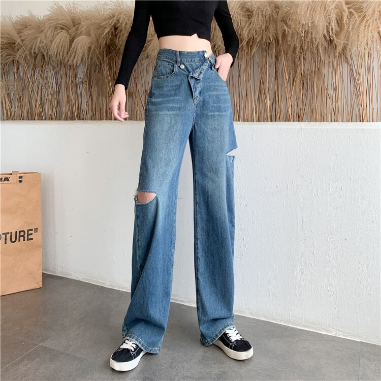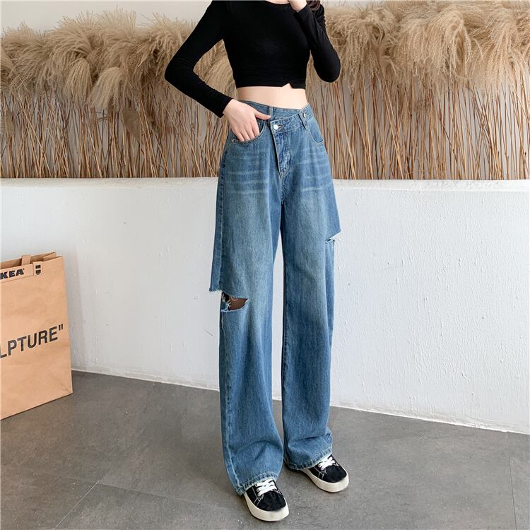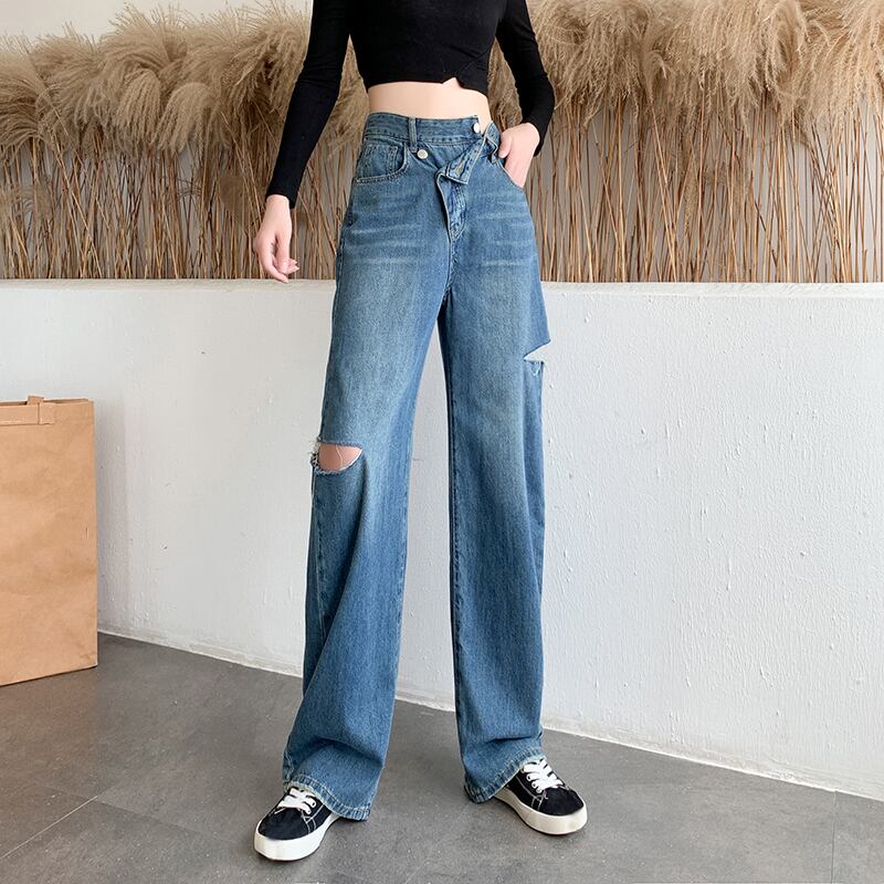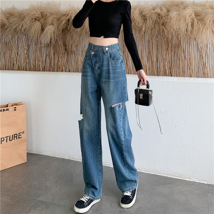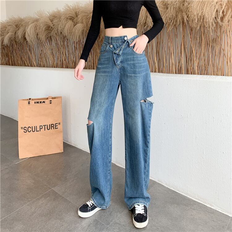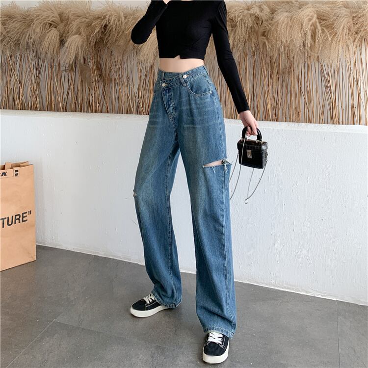 破れたジーンズの女性の2020年秋新バージョンのルーズワイドレッグパンツレトロスリムハイウエストストレートパンツ クレセントシティ92618087894