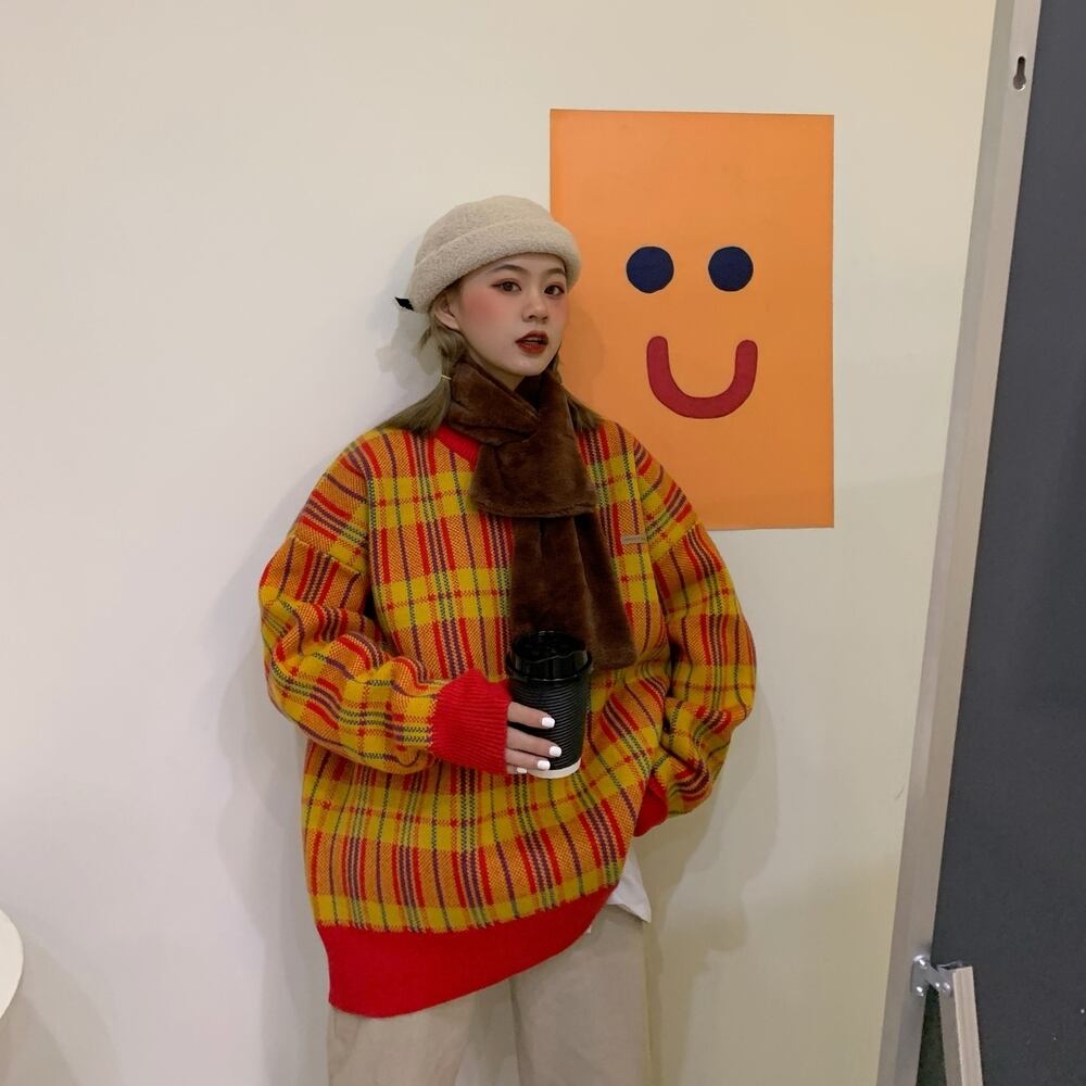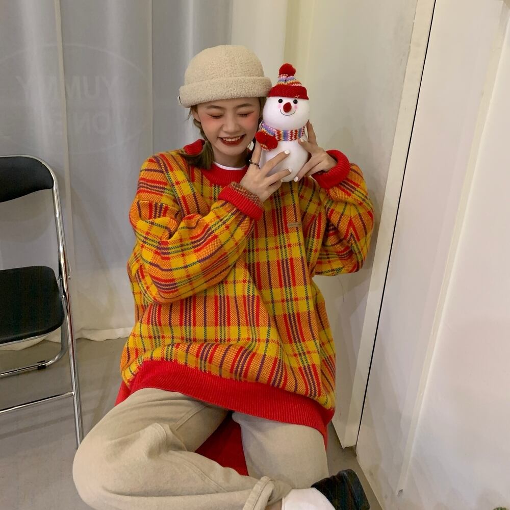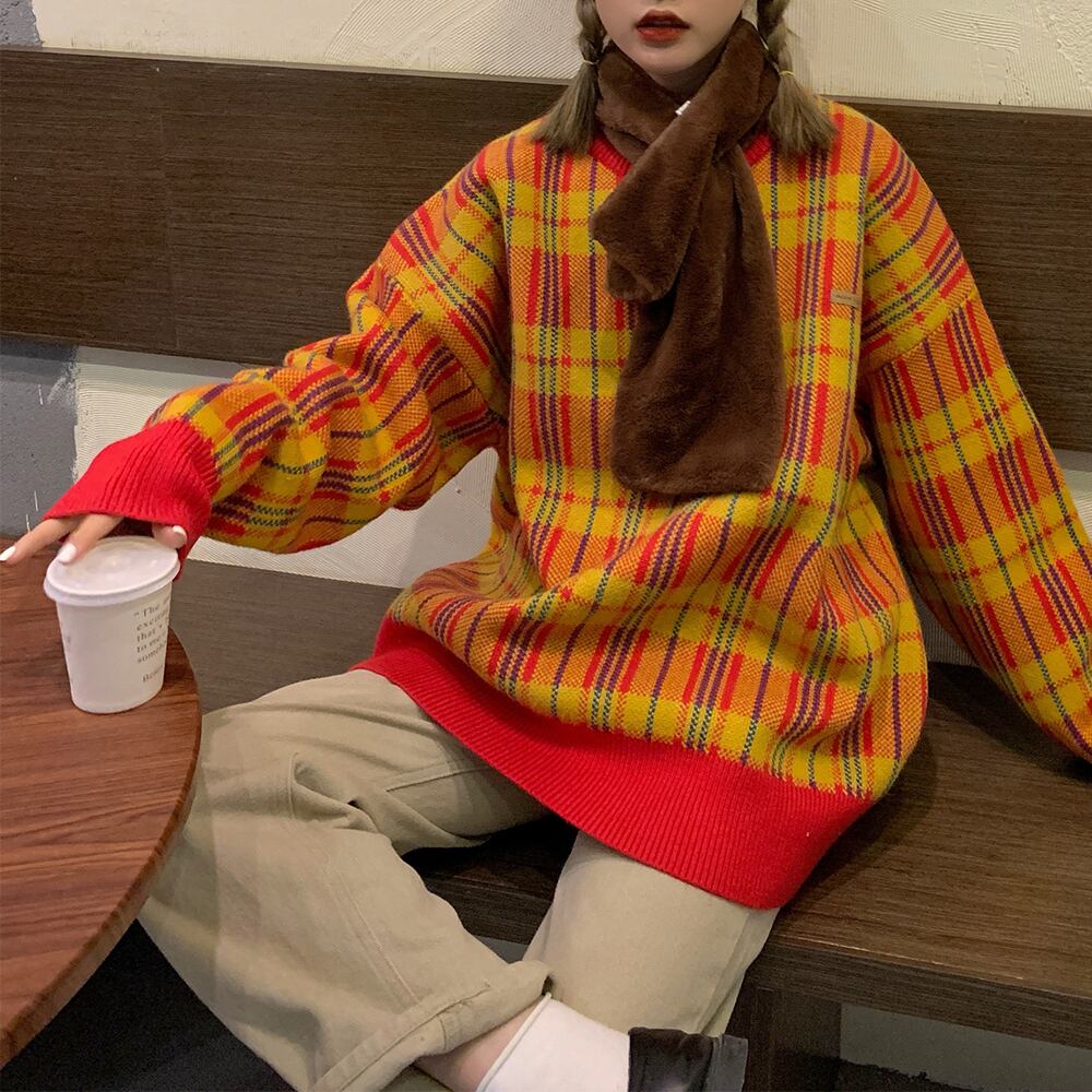シックな暖かい格子縞のセーターのバージョン2020年初秋新しいルーズミドル丈デザインコントラストセーター クレセントシティ39803587245