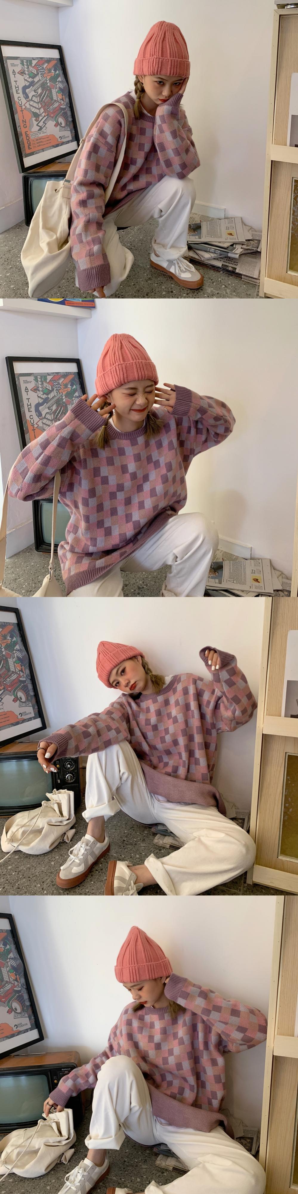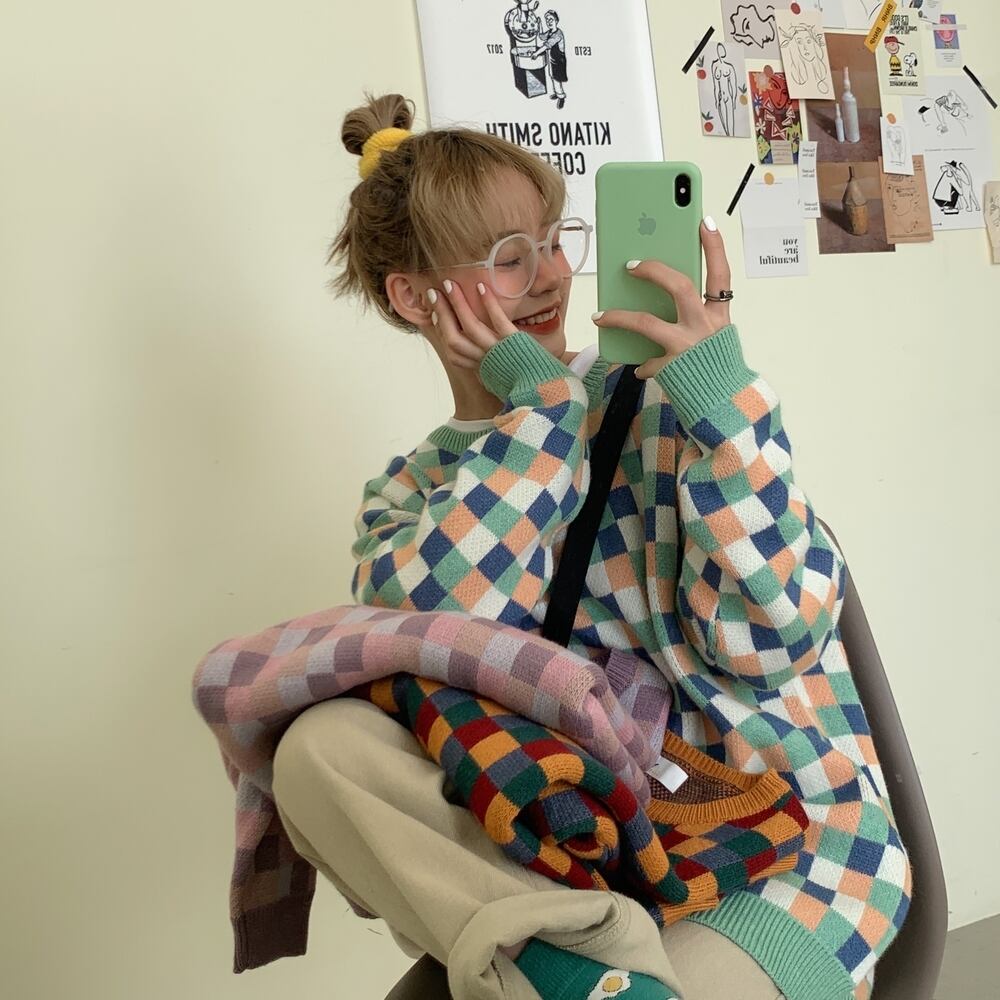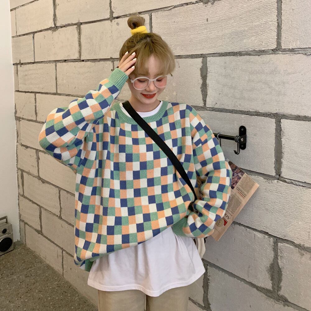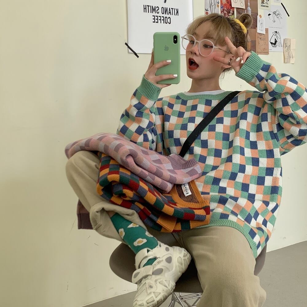 2020年秋冬の新しいシックなワイルドルーズチェック柄コントラストカラープルオーバーセータートップラウンドネックセーター女性 クレセントシティ72238707431