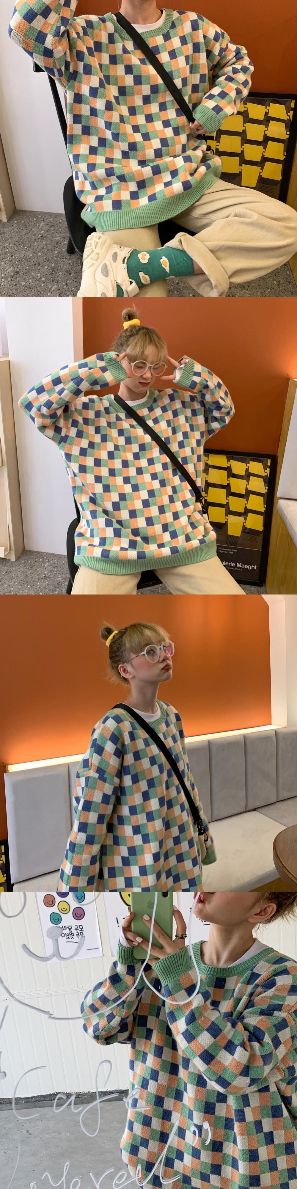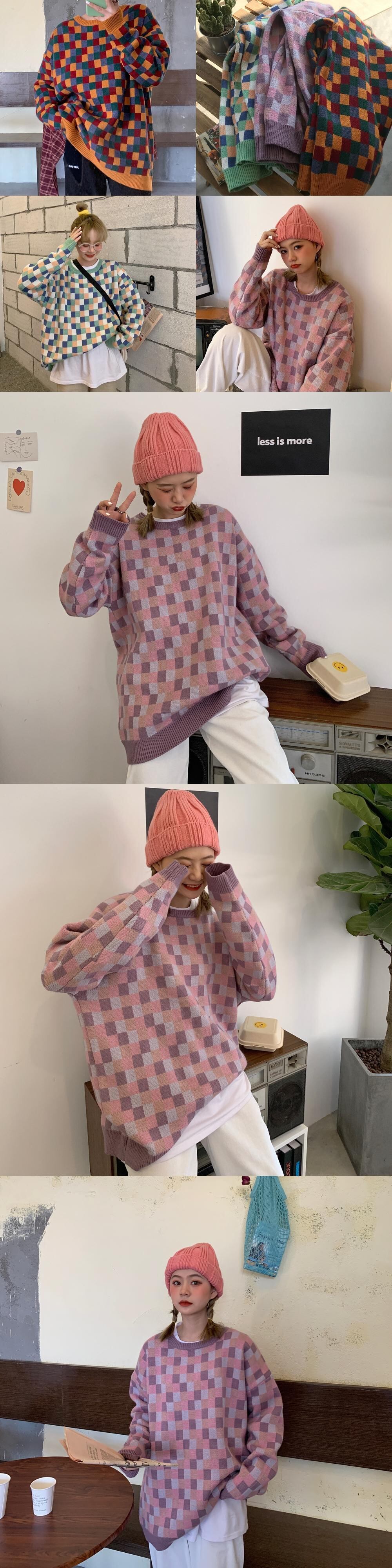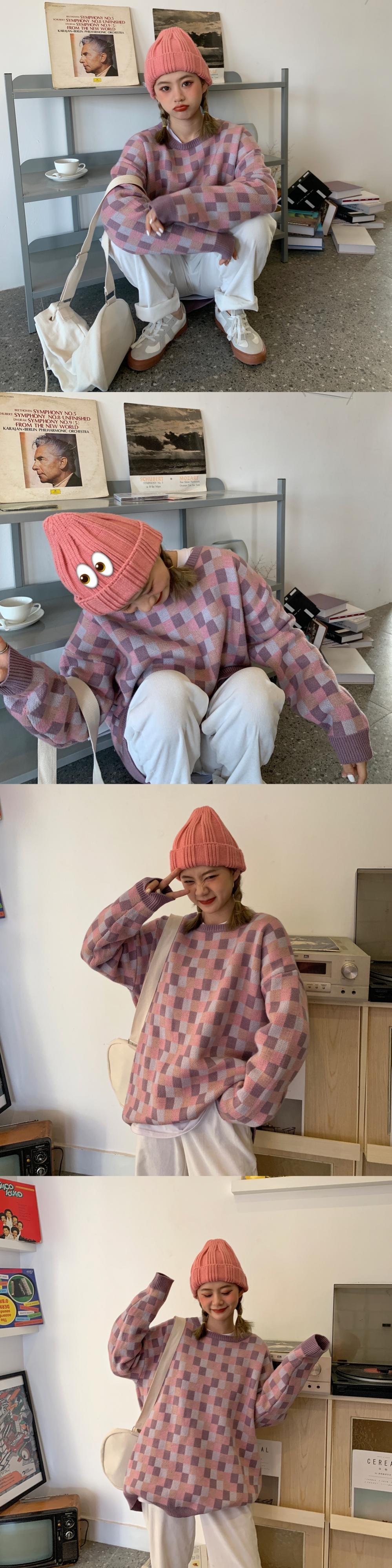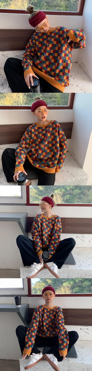 2020年秋冬の新しいシックなワイルドルーズチェック柄コントラストカラープルオーバーセータートップラウンドネックセーター女性 クレセントシティ72238707431