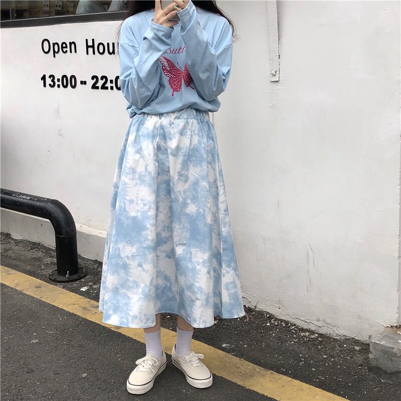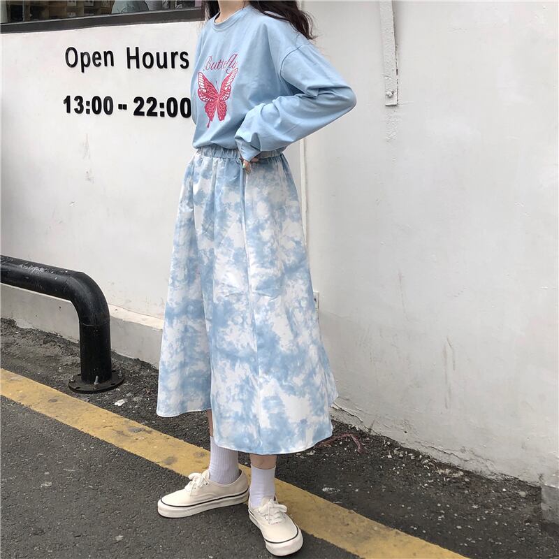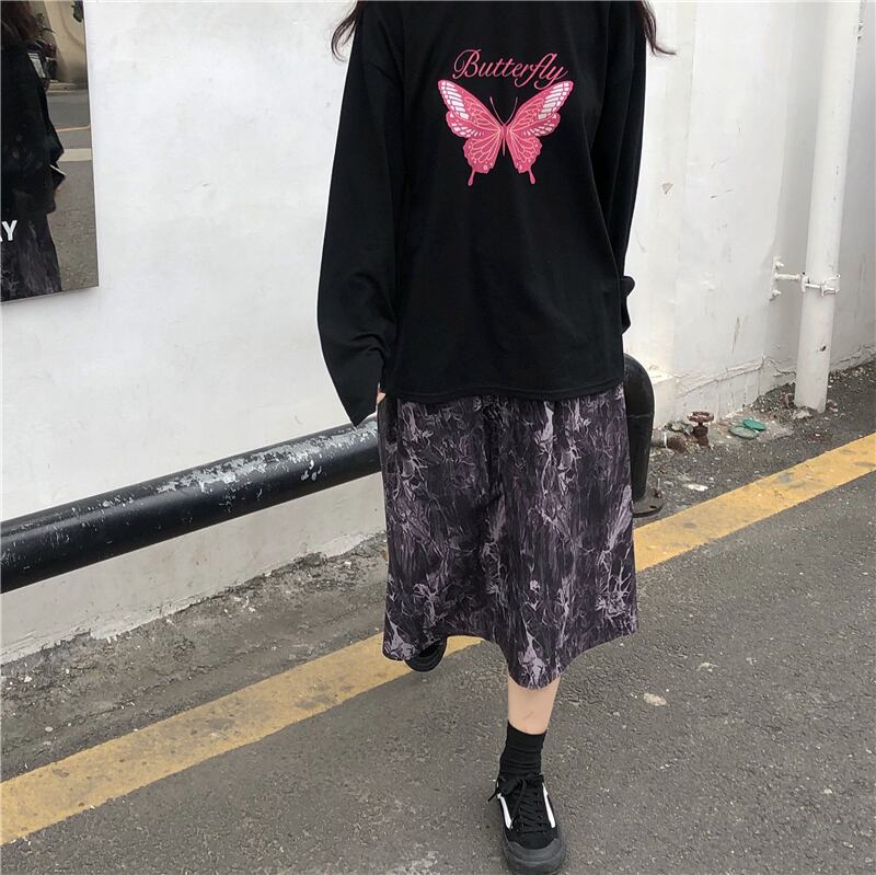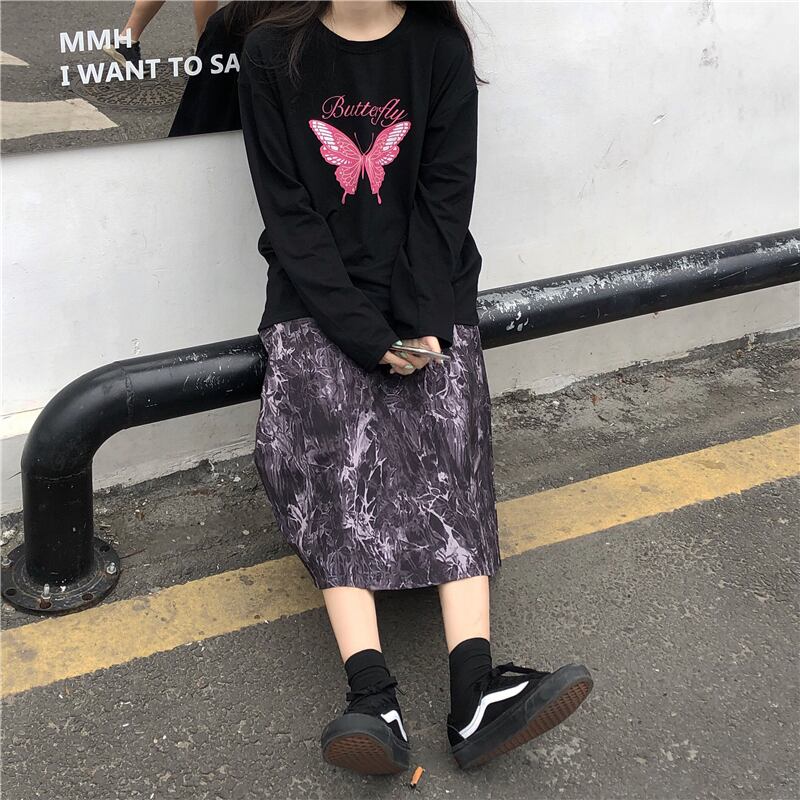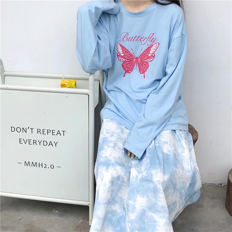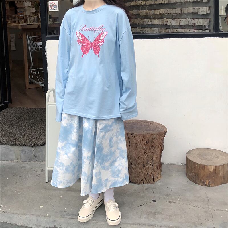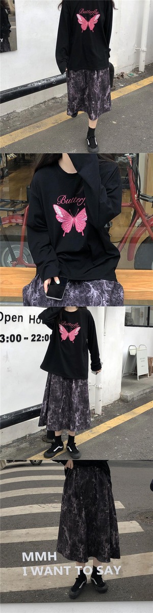 インスタイドバタフライプリント長袖Tシャツメス+絞り染めハイウエストAラインミドル丈スカートツーピース秋バージョン クレセントシティ18998194324