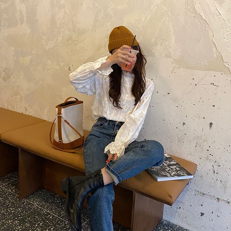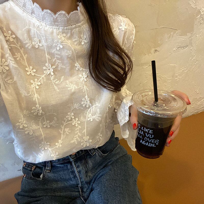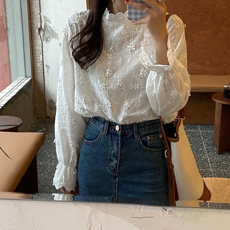 ホワイトシャツ女性デザインセンスニッチ2020新バージョンルーズ秋冬スタンドカラーレース立体レースシャツ クレセントシティ54523680507