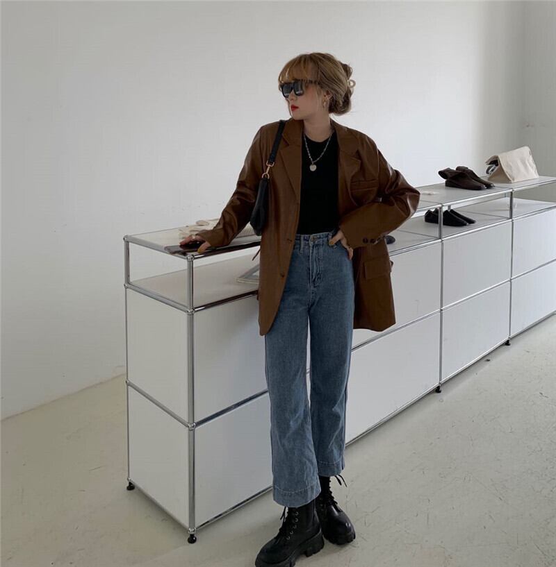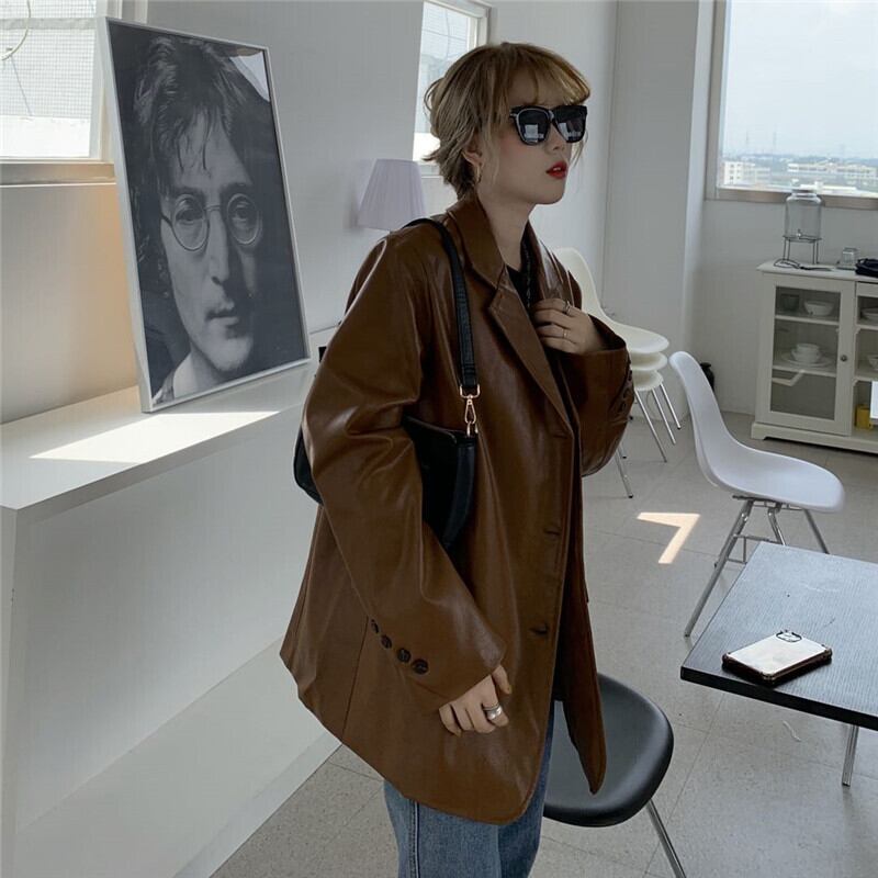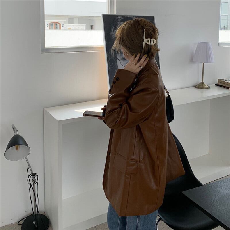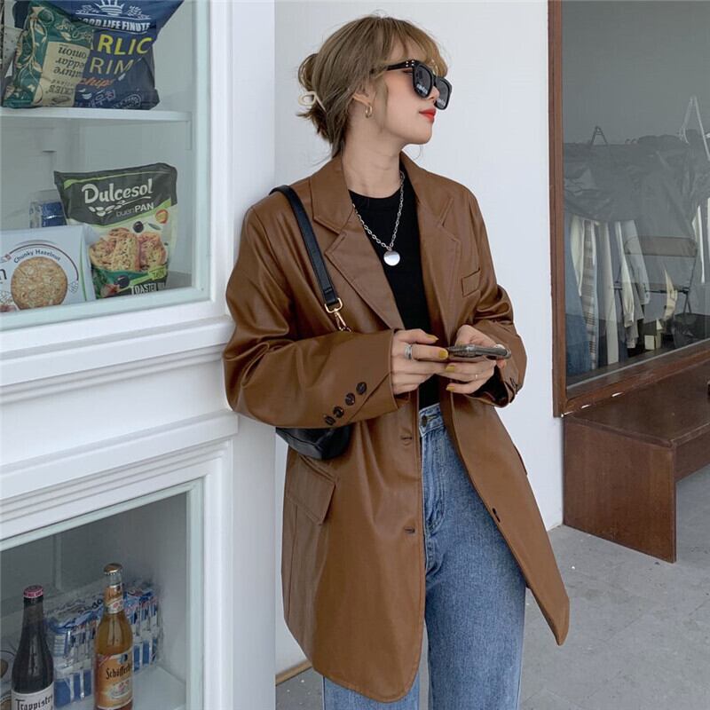 揚げストリートジャケット女性2020新しい秋のシングルブレストルーズで薄いミドル丈ハンサムなオートバイの革の服のトレンド クレセントシティ88661332590