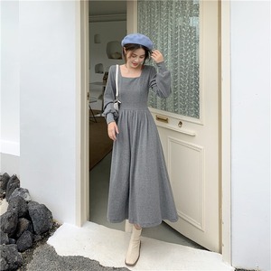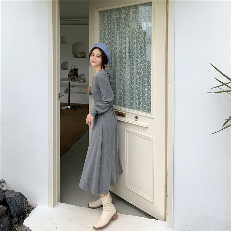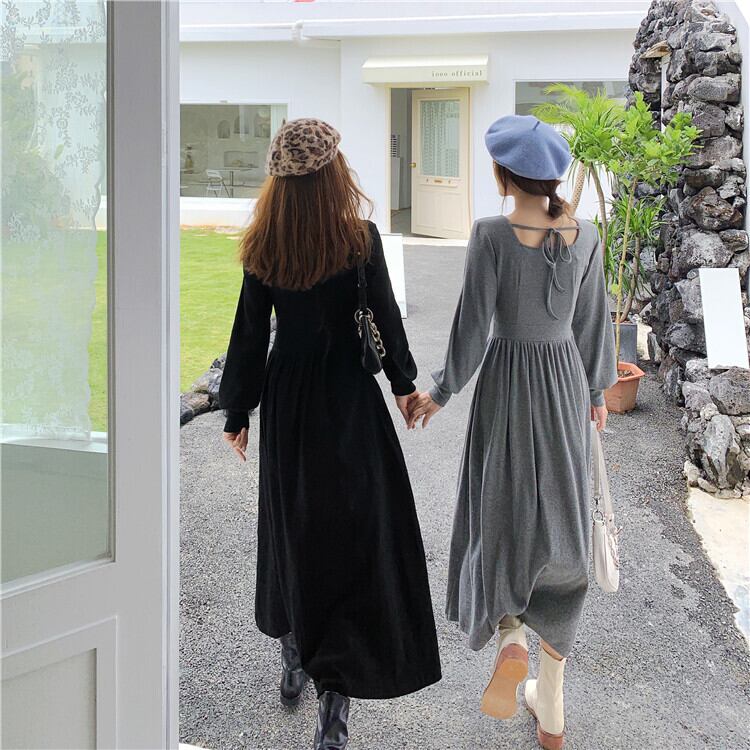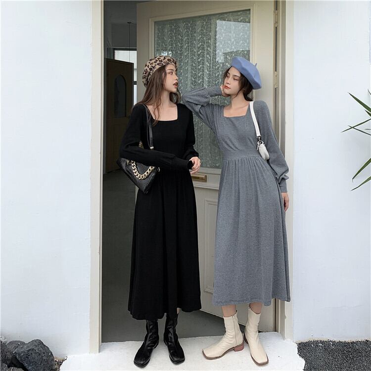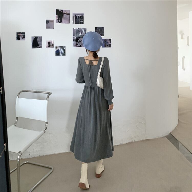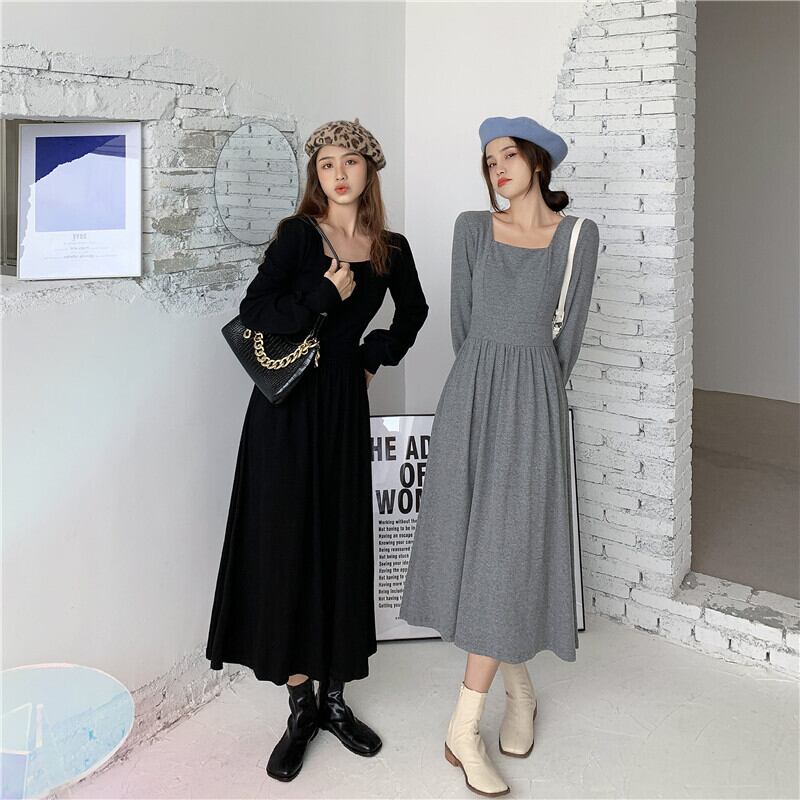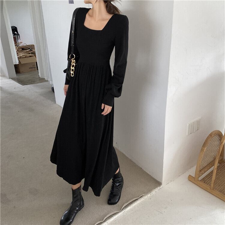 ドレスレディース2020新しい秋と冬フランスの気質スクエアネックレースバック小さなハイウエストルーズウエストロングスカート クレセントシティ93688277483