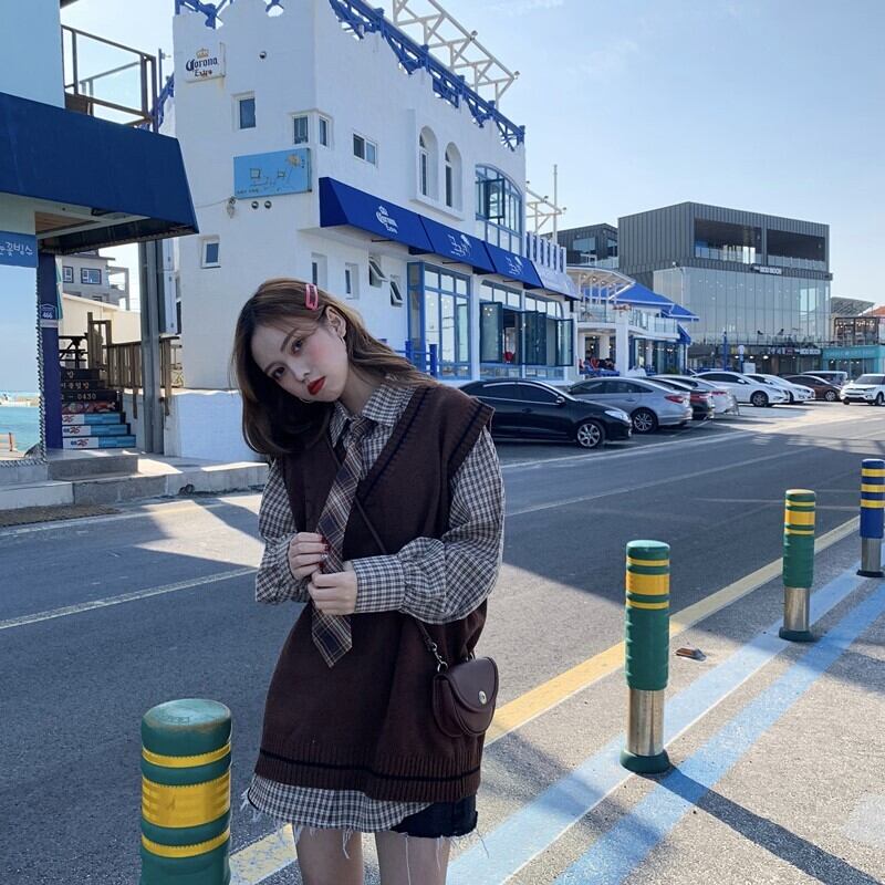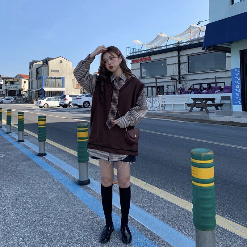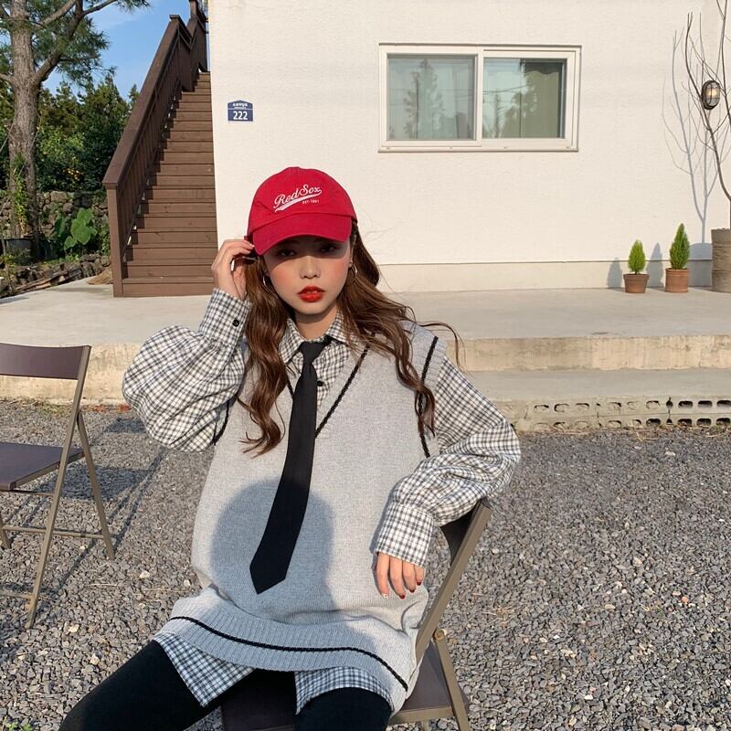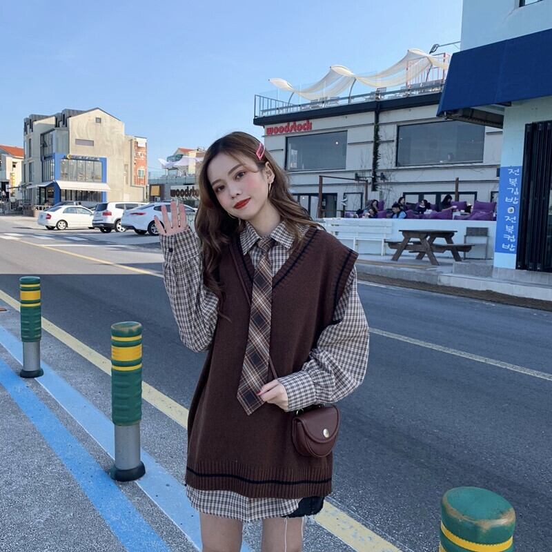 スーツ女性の2020年初秋新しいルーズニットベスト+薄い長袖チェック柄シャツ+ネクタイ クレセントシティ25425046621