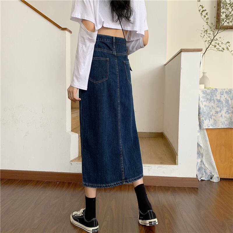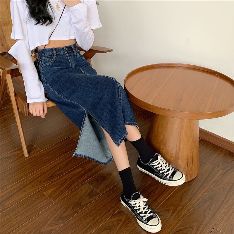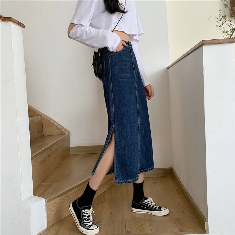 デニムスカートレディース2020年初秋新作ファッションオールマッチハイウエストシンスプリットミドル丈Aラインスカート クレセントシティ59053468680