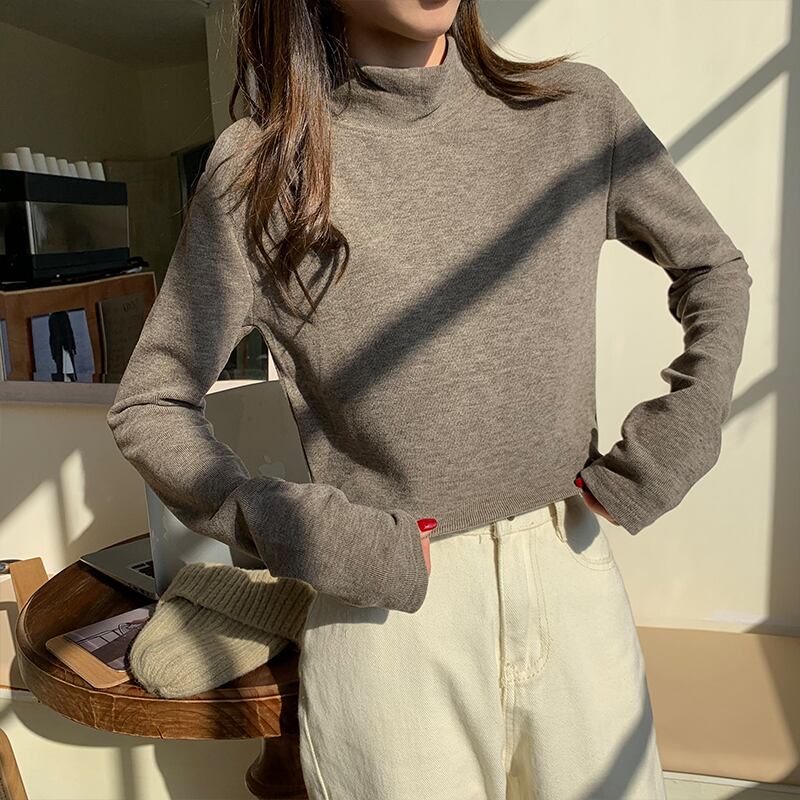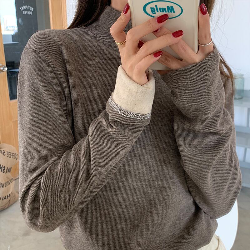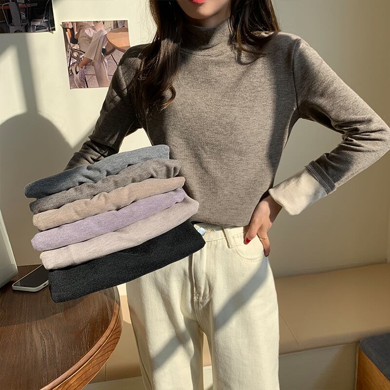 クレセントシティのハーフハイカラーのボトミングシャツの女性、秋冬、ウエスタンスタイルのワイルドプラスベルベットの厚手の無地の長袖Tシャツ クレセントシティ78632062482