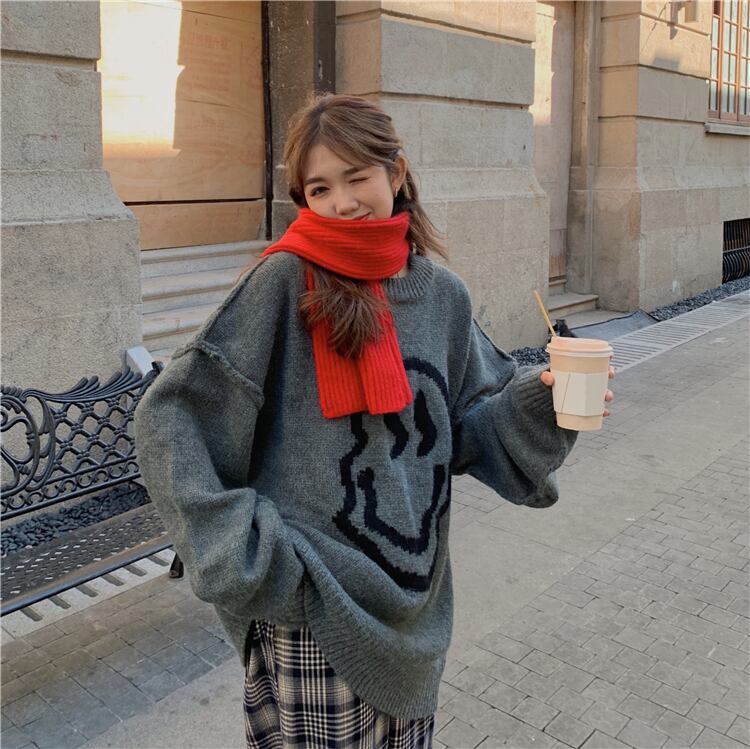 太郎パープルスマイルフェイスジャカードニットトップレディース2020年秋冬新作スタイルルーズミドル丈カジュアルセータートレンド クレセントシティ47920323841