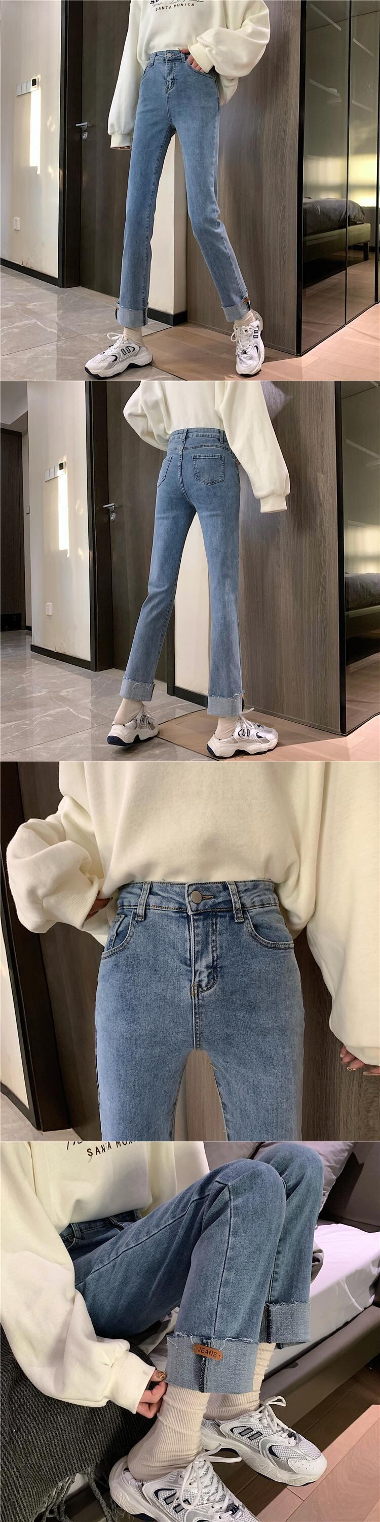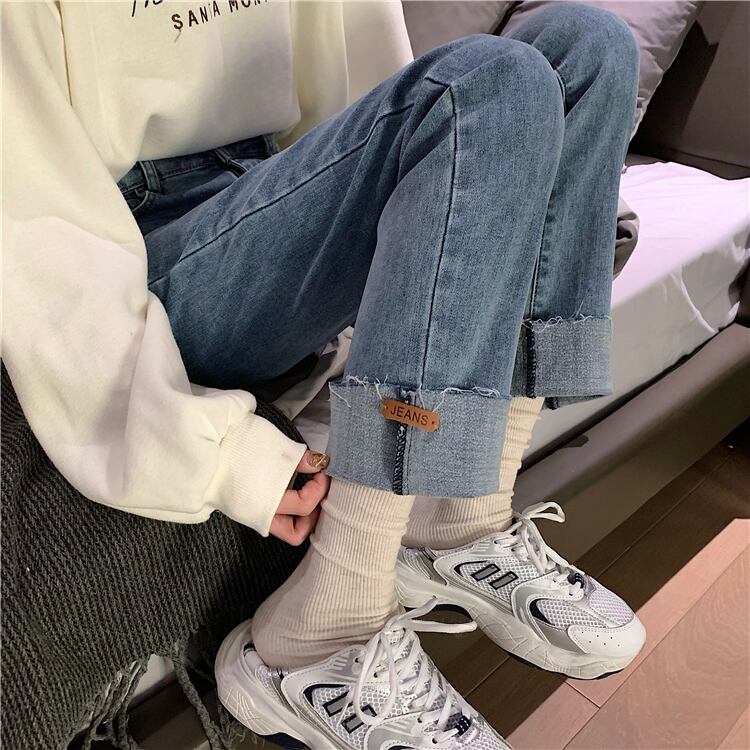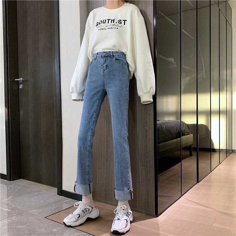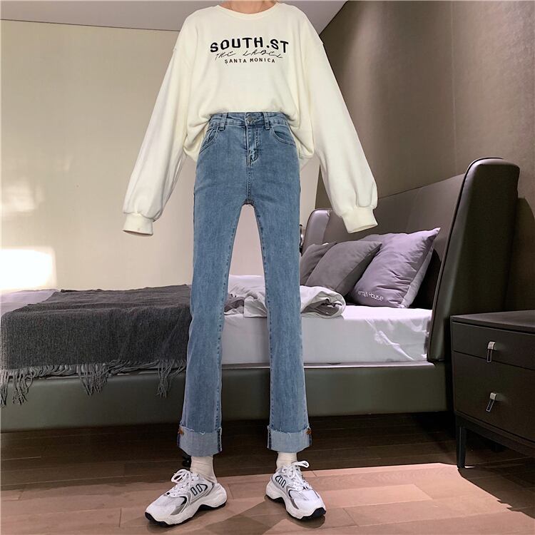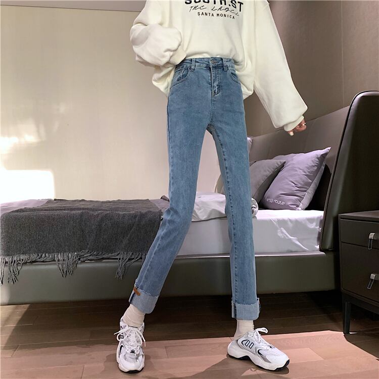 ライトブルーのハイウエストジーンズの女性は薄くて小さい2020年秋冬の新しいスタイルのカールしたデザインセンスストレートレッグパンツ クレセントシティ53942626530