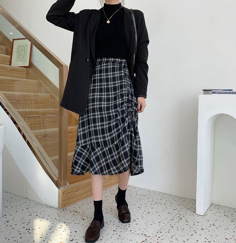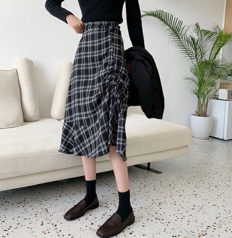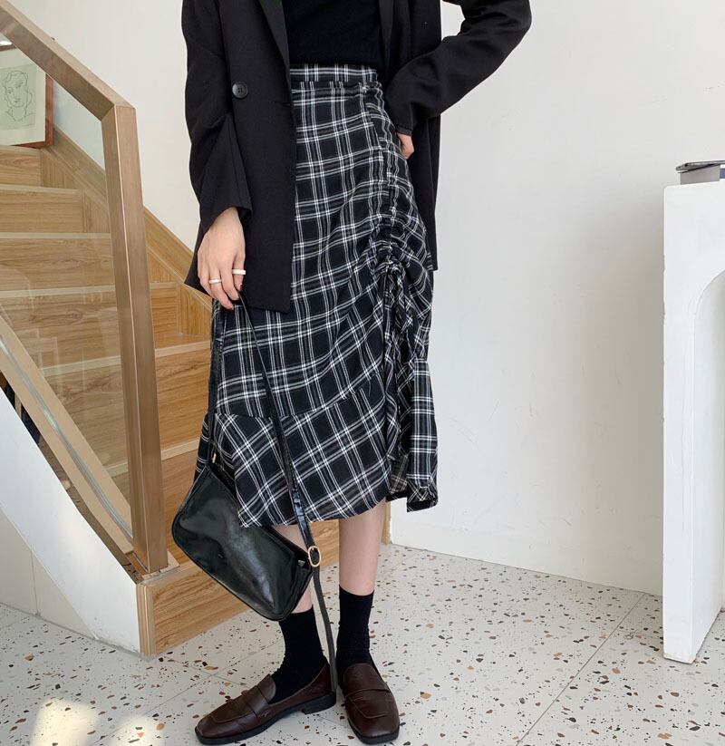 黒と白のチェック柄スカートレディース秋冬ハイウエストデザインセンスプリーツミドル丈スモールチェック柄Aラインスカート クレセントシティ85776455795