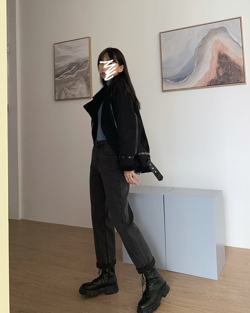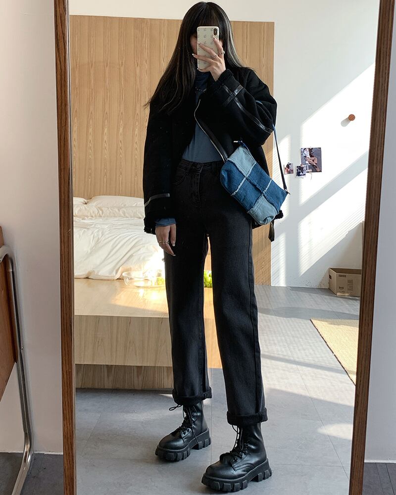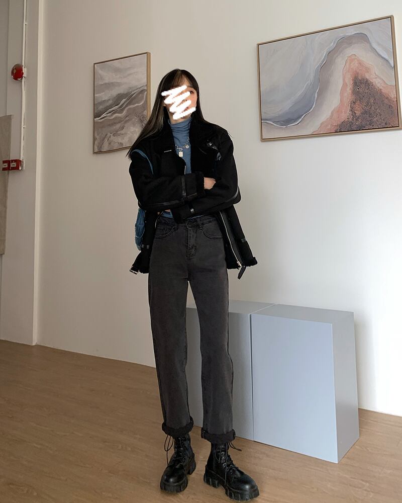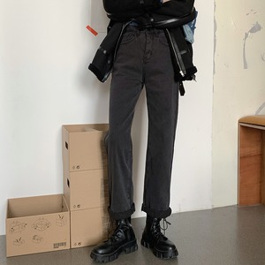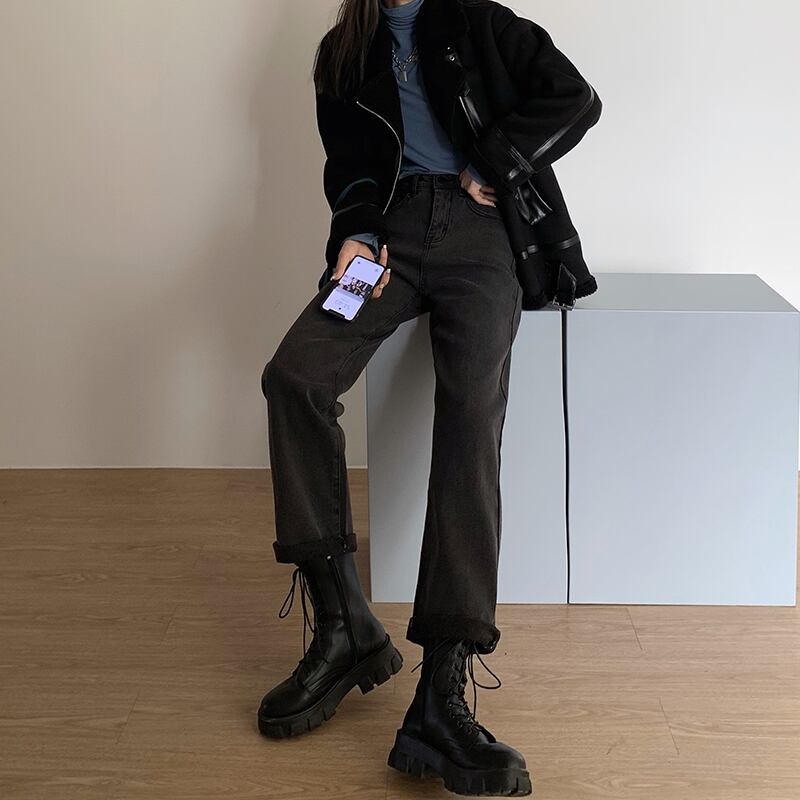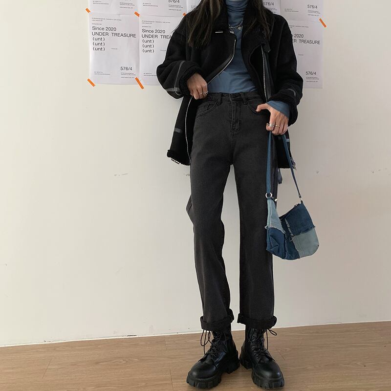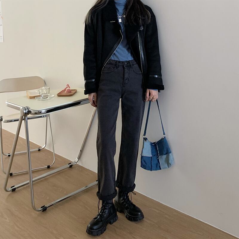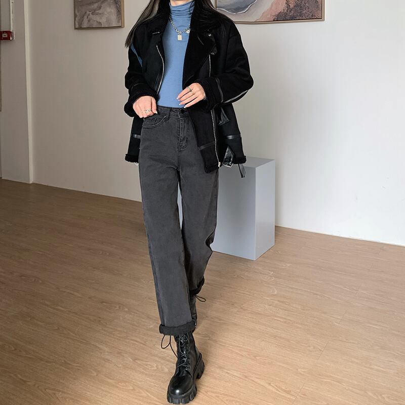 スモーキーグレーのハイウエストジーンズの女性のバージョンは薄い2020年の秋と冬です新入生はブラッシュドルーズストレートレッグパンツを厚くしました クレセントシティ34614080893