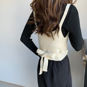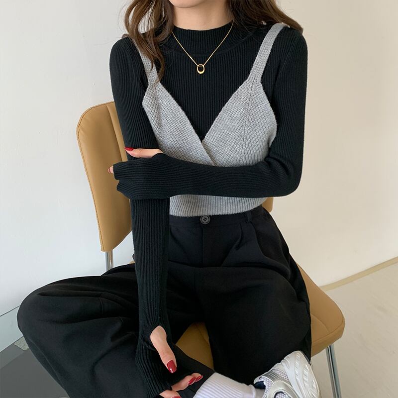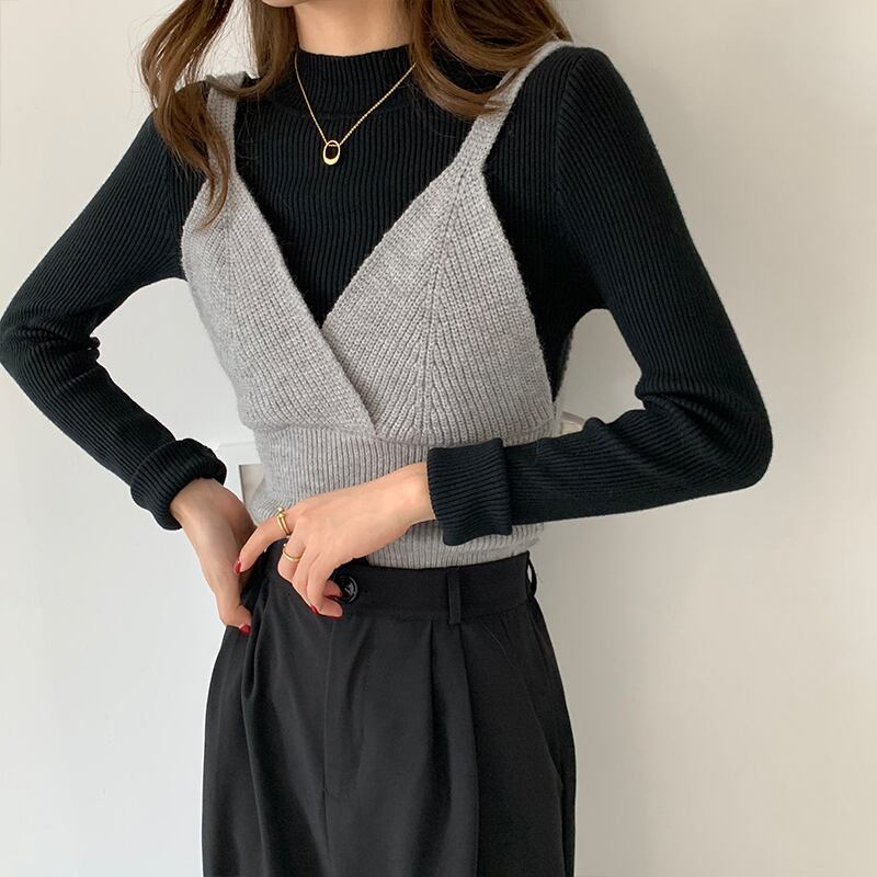 クレセントシティは、オールマッチのウエスタンスタイルのニットレースアップキャミソール+ハーフハイカラーのボトミングセーターツーピースの女性を積み重ねて着用しています クレセントシティ29400995217