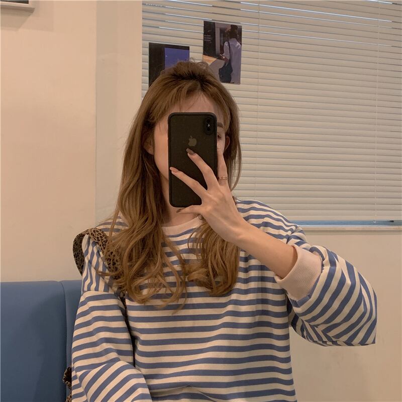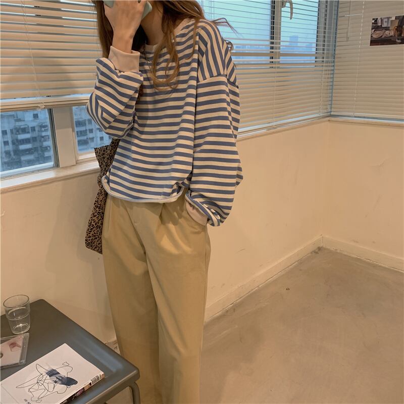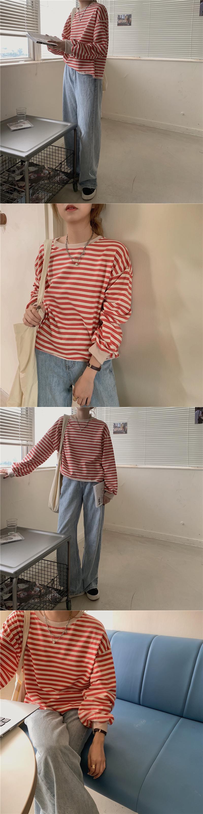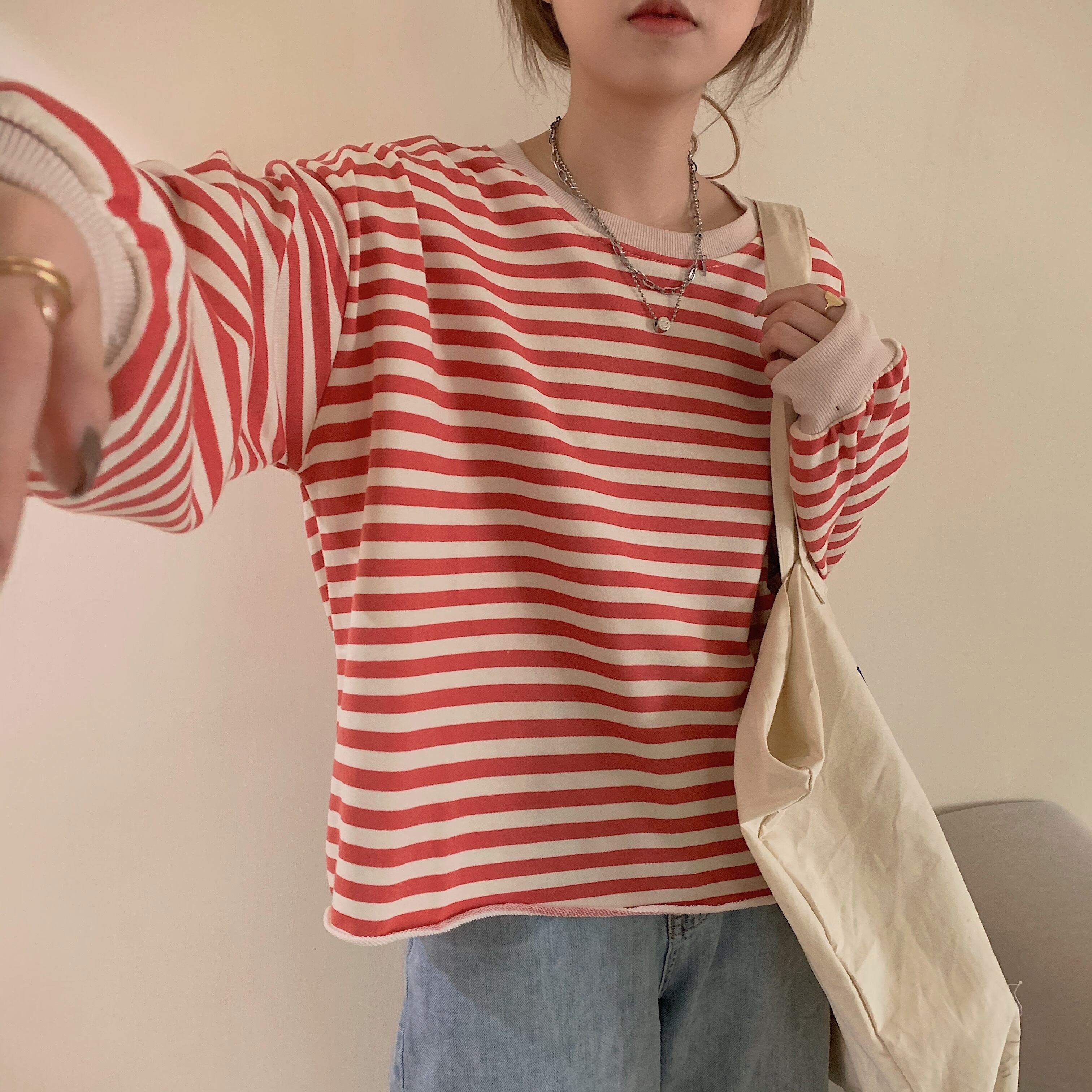ラウンドネックプルオーバー トップス ストライプTシャツ レディースルーズ ロング オータム 秋物 ウィンター 冬物 Oネック クレセントシティ29344197931