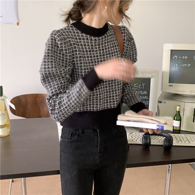 スリーブトップス カラールーズ格子柄ショートカジュアルニットセーター オータム 秋物 ウィンター 冬物 クレセントシティ93331683154