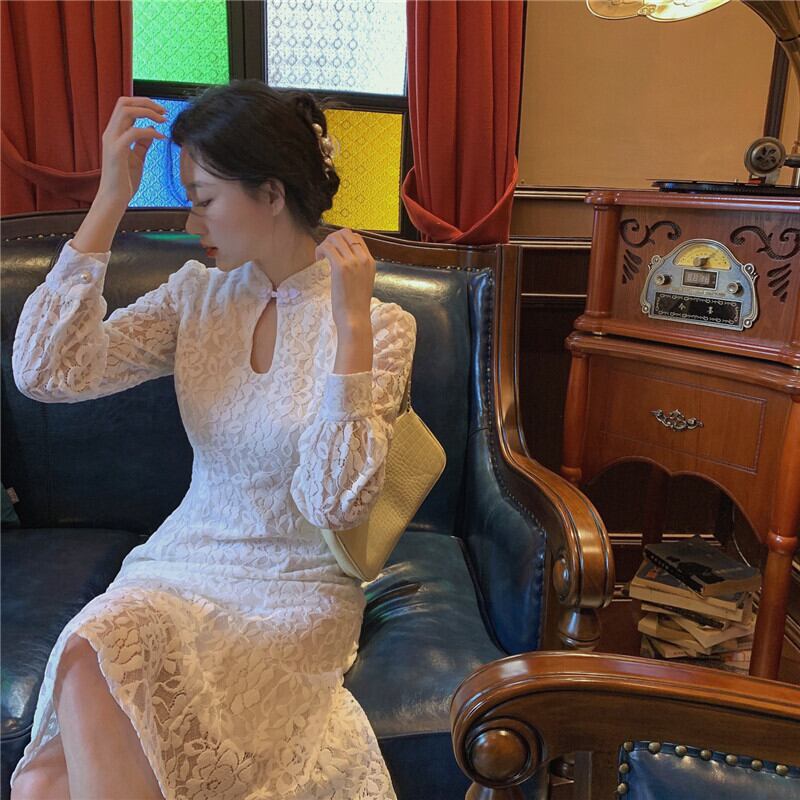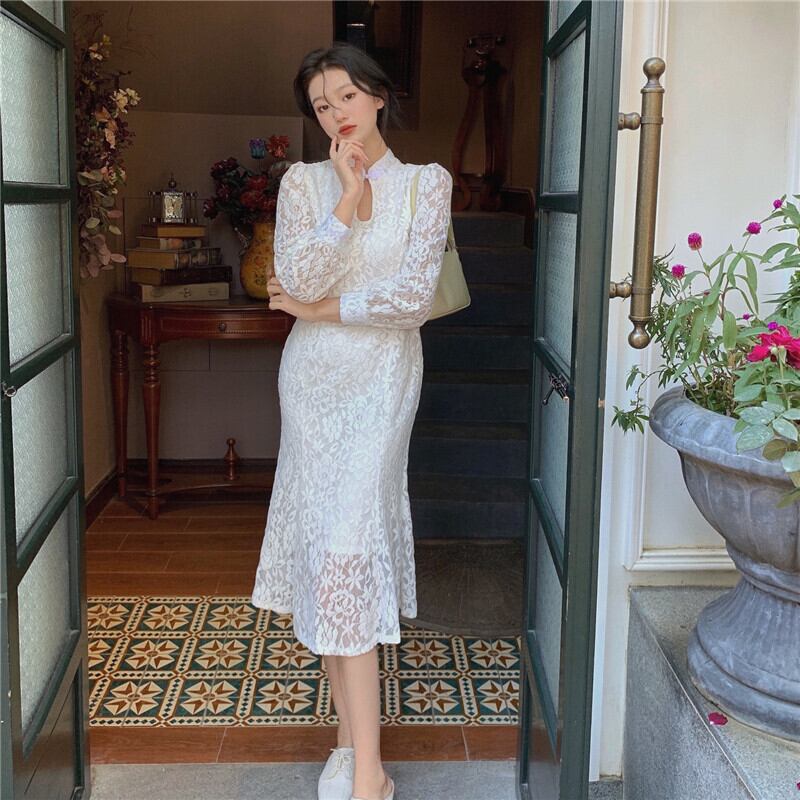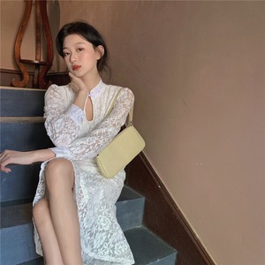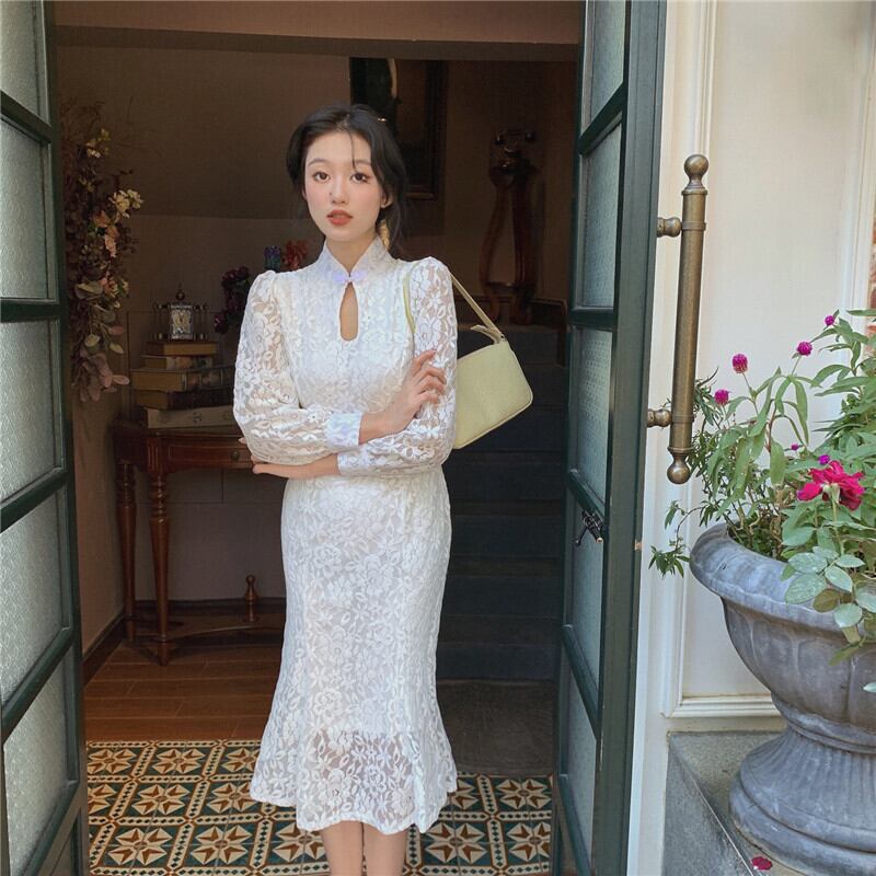 ヴィンテージドレス オータムスリム薄手レースホワイトロングスカート 秋物 ビンテージ クレセントシティ10796580623
