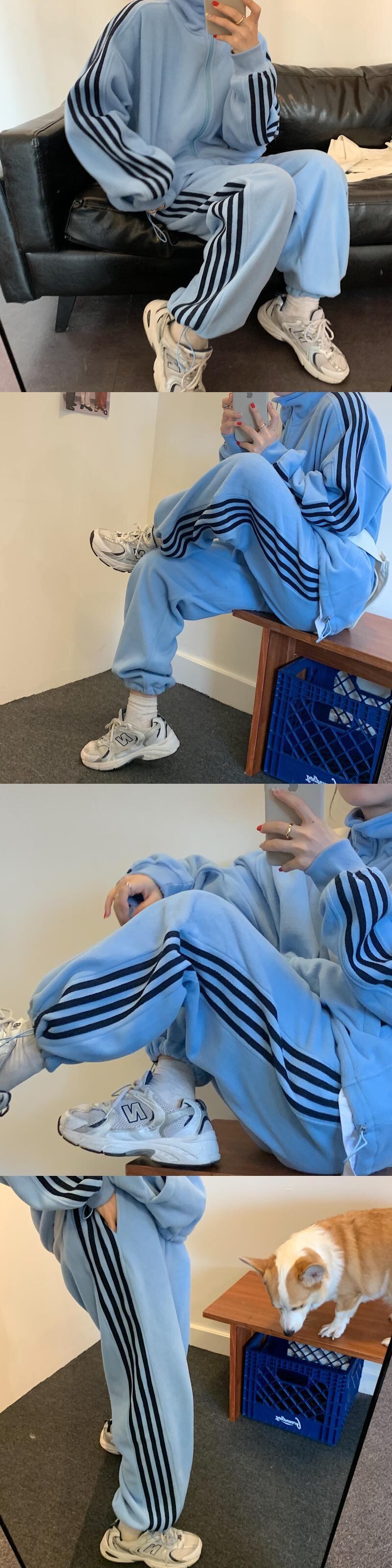 色:青いコート,ピンクのジャケット,黒いジャケット,青パンツ,ピンクのパンツ,黒いズボン
