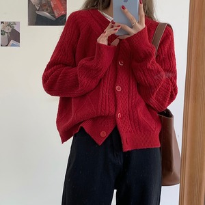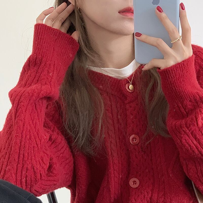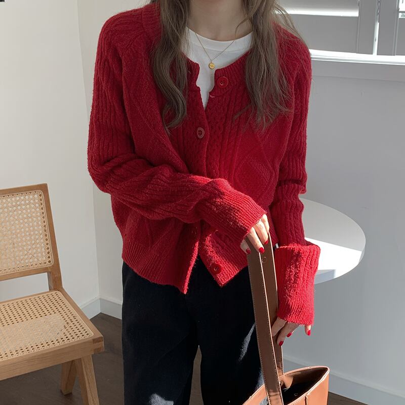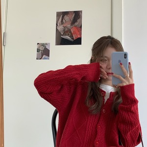 スタンダードレッドニットカーディガンオータムウィンタールーズセーター ジャケット レトロ 秋物 冬物 クレセントシティ91839539890