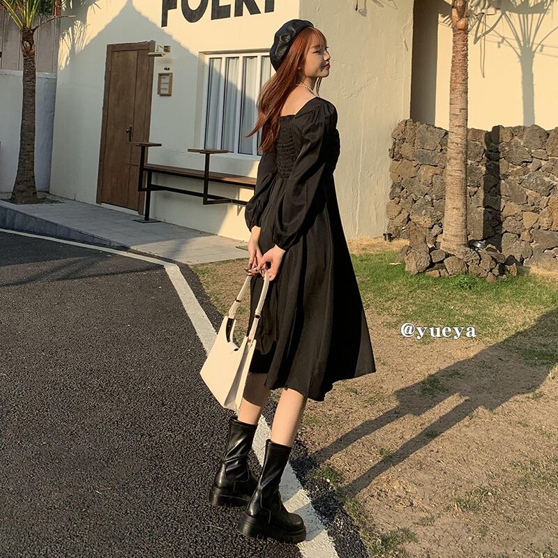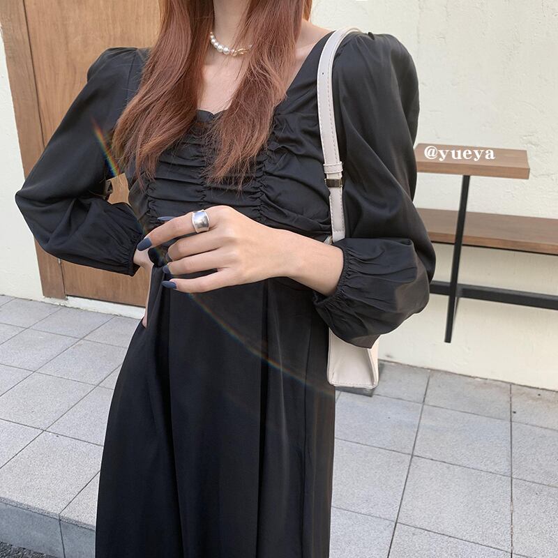 スタンダードブラックドレス ウェストカラーレディース ロング レトロ オータム 秋物 ウィンター 冬物 スクウェア クレセントシティ38163493583