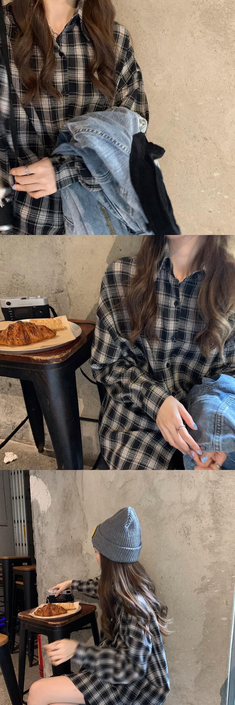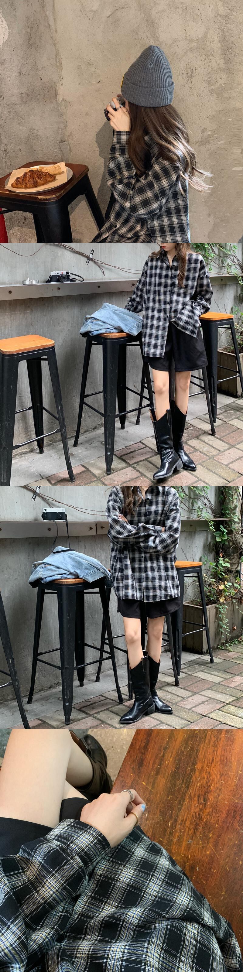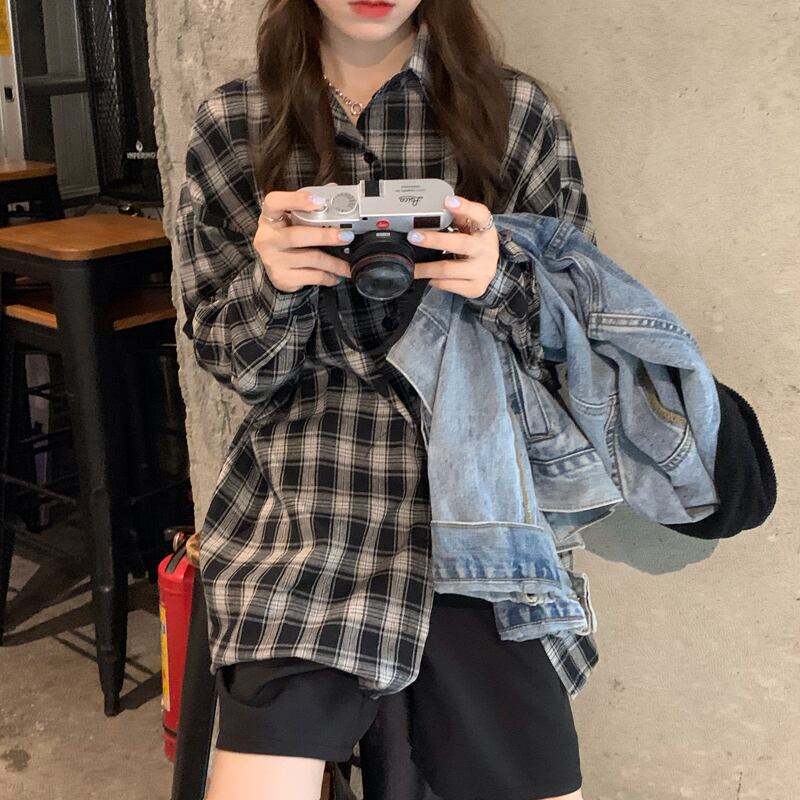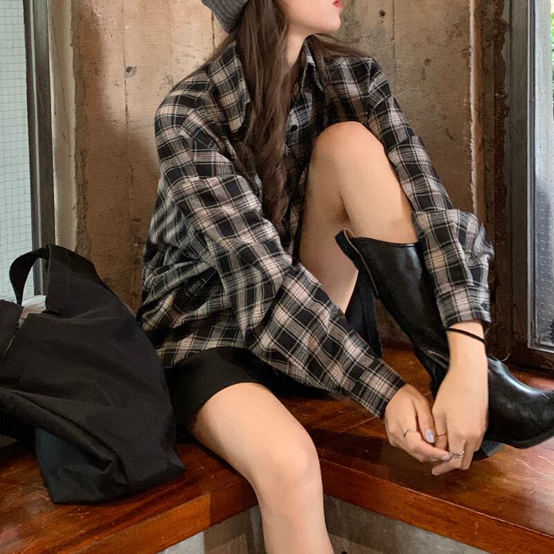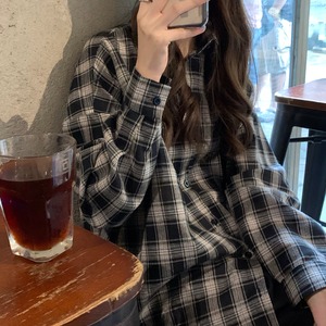 ルーズブラックホワイト格子柄シャツ レディースオータムスタンダード レトロ 秋物 クレセントシティ34430850423