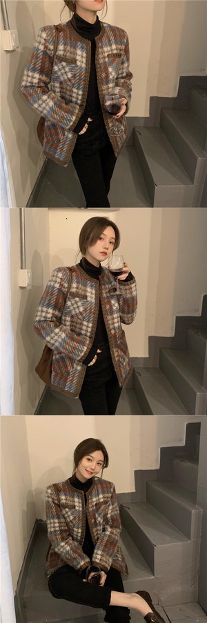 格子柄ジャケット オータムウィンタースタンダードラウンドネックルーズカーディガン レトロ 秋物 冬物 Oネック クレセントシティ33124606768