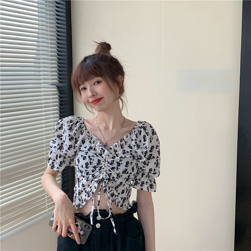 スタンダードシフォンシャツ サマースタイルハイウェストショートクロップトップ トップス レトロ 夏物 クレセントシティ26969882388