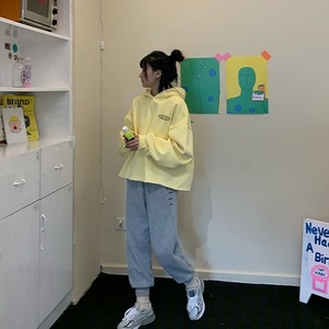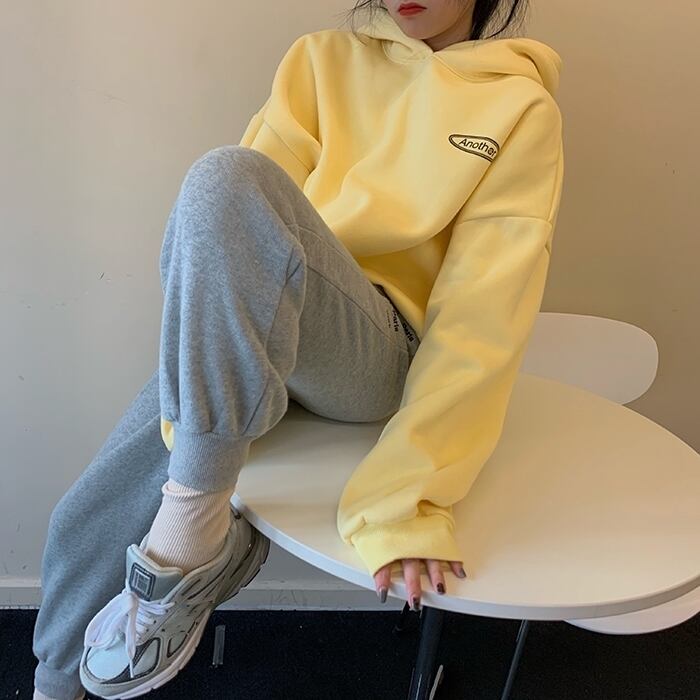 色:薄黄色のセーター,ラズベリーのスウェットシャツ,グレーガードパンツ,黒パンツ