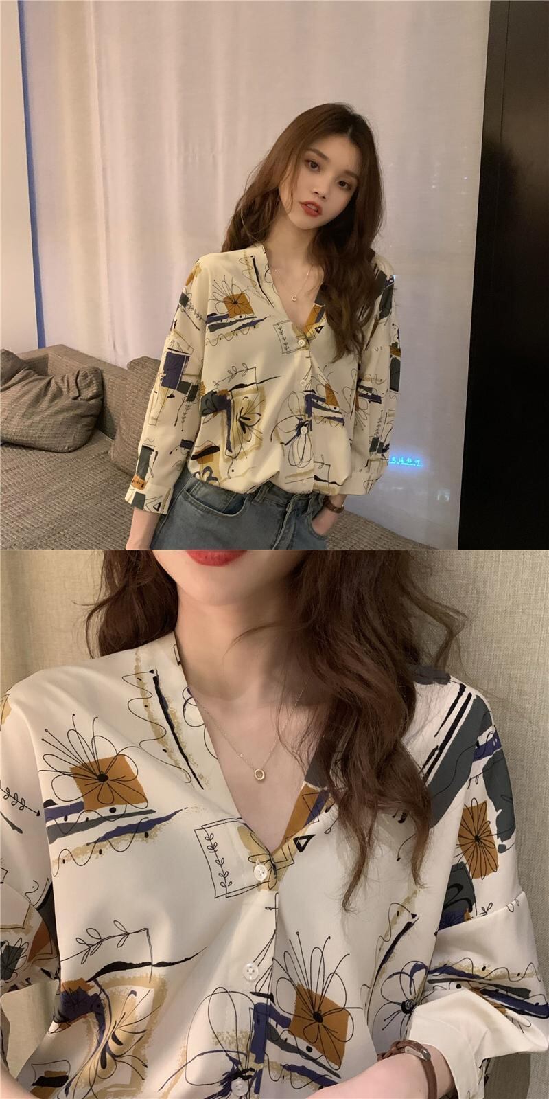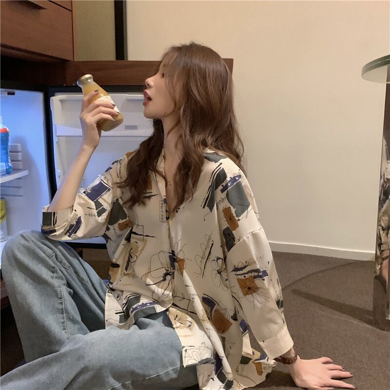 スリーブプリントシャツ サマーカジュアルルーズVネック 夏物 クレセントシティ36573802495