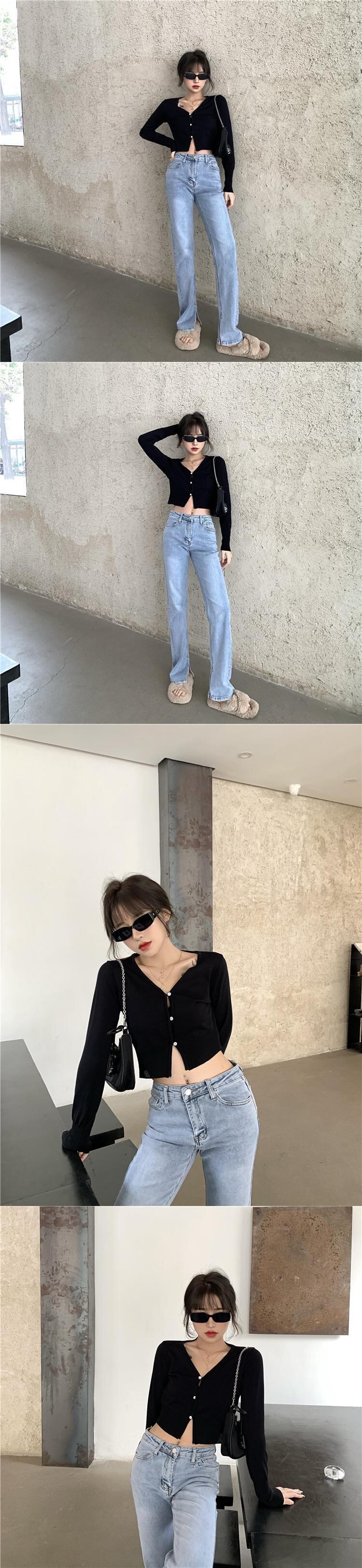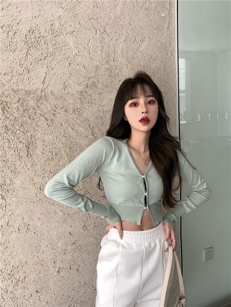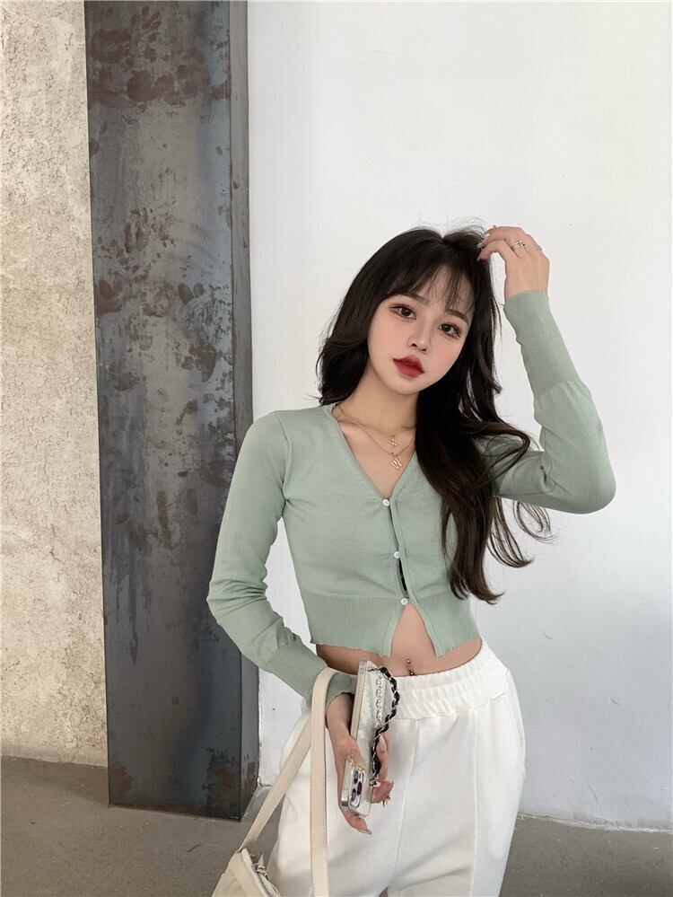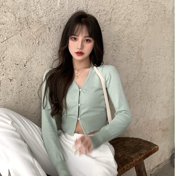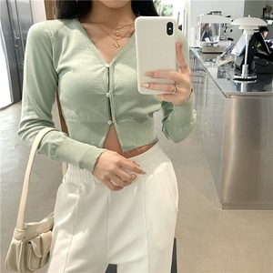 ショートVネックニットTシャツ サマースリム薄手ソリッド カラーカーディガントップス ロング 夏物 ソリッドカラー クレセントシティ63567340323