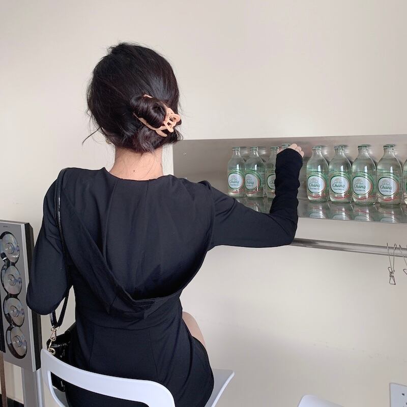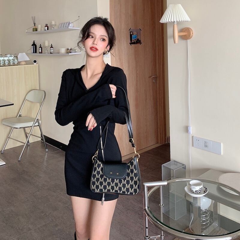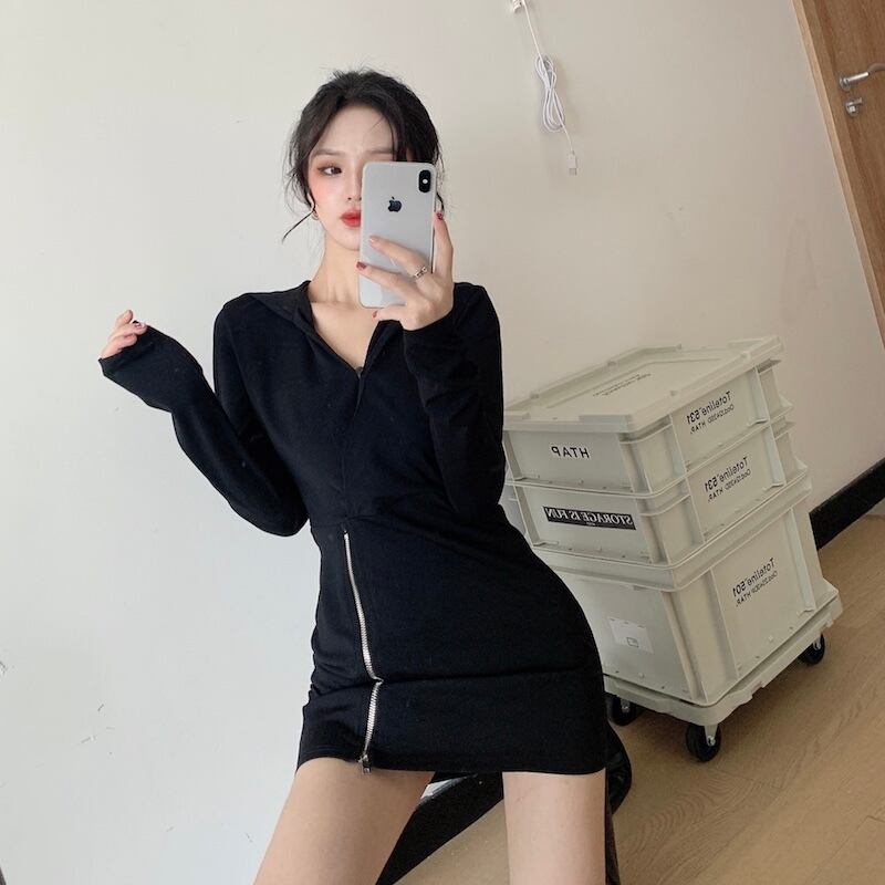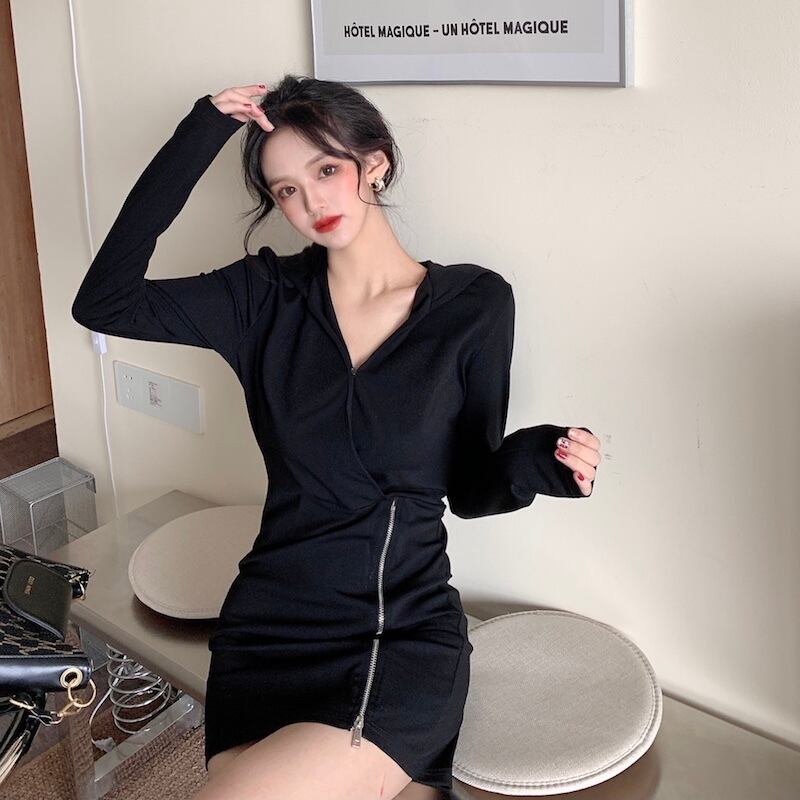 スタンダードブラックVネックドレス フードジッパーハイウェストウェストショートスカート ロング レトロ クレセントシティ72507909855