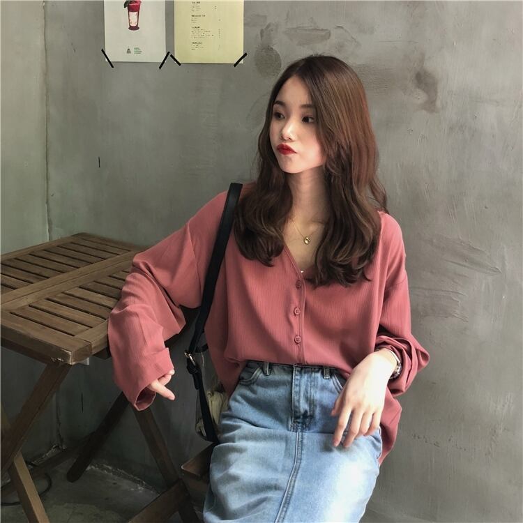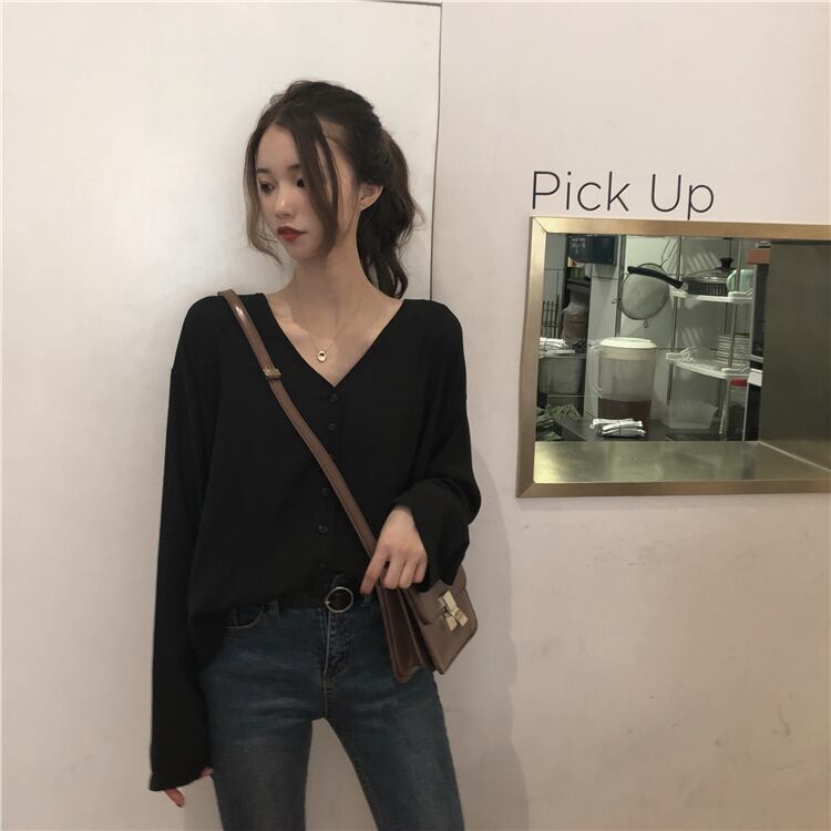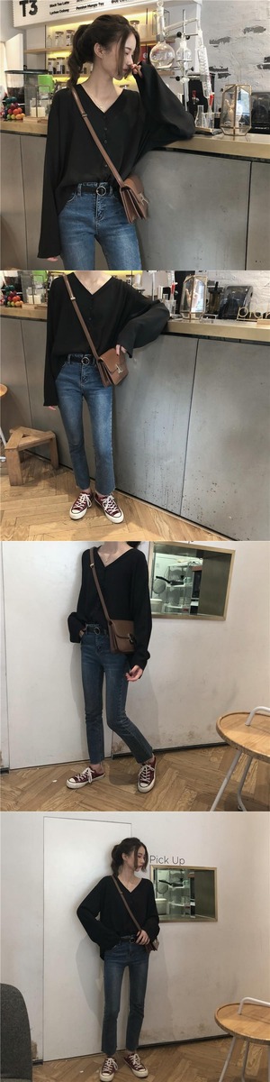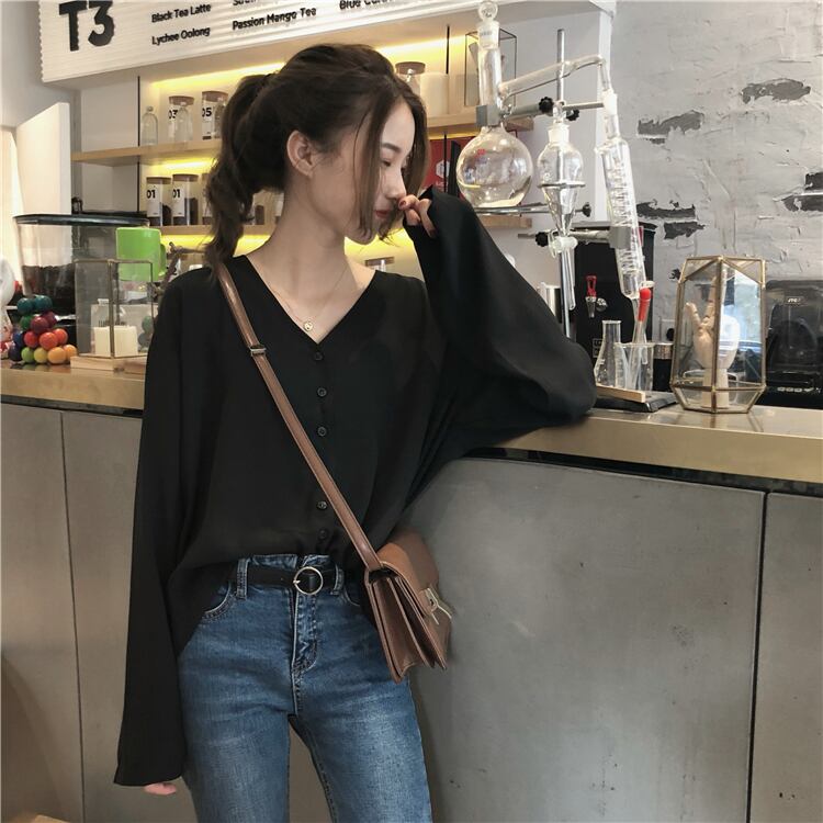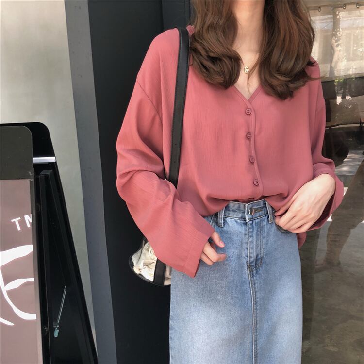 スタンダードルーズVネックシフォンシャツ ロング レトロ クレセントシティ62338019791