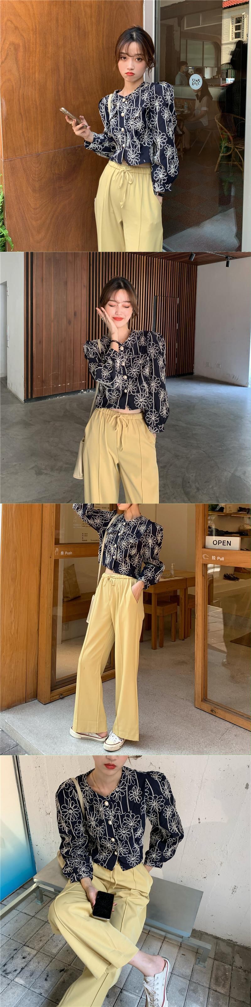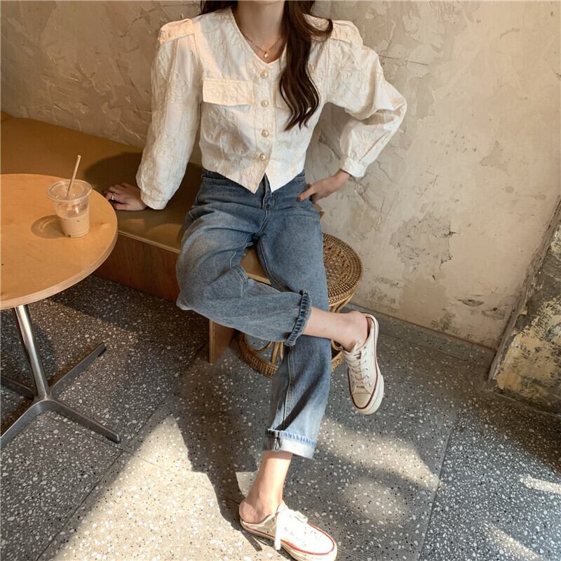 スタンダードスリーブシャツ スプリングルーズVネックショートトップス レッド レトロ 刺繍 春物 クレセントシティ51567146320