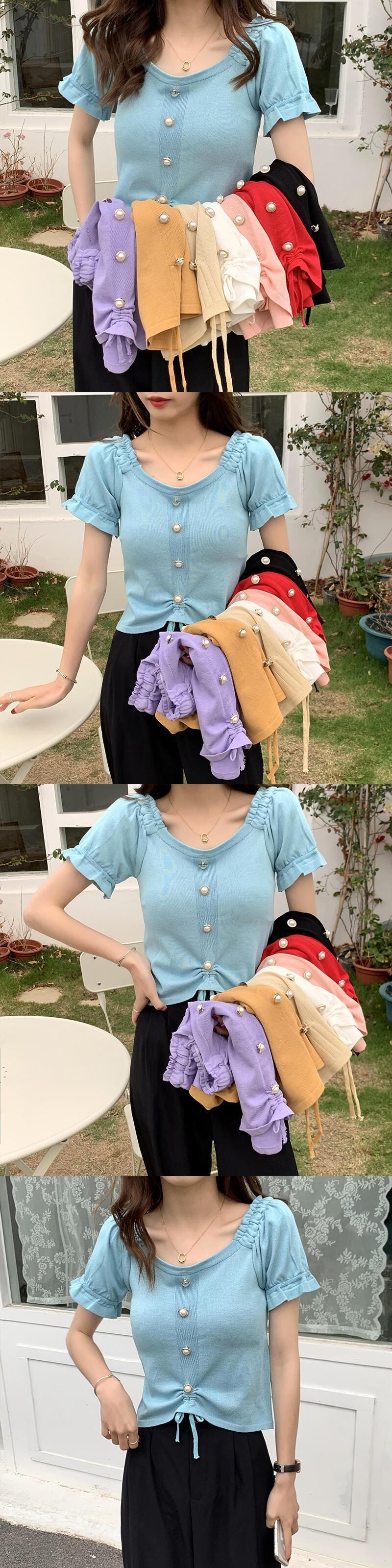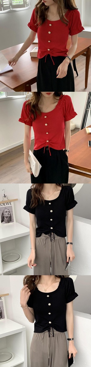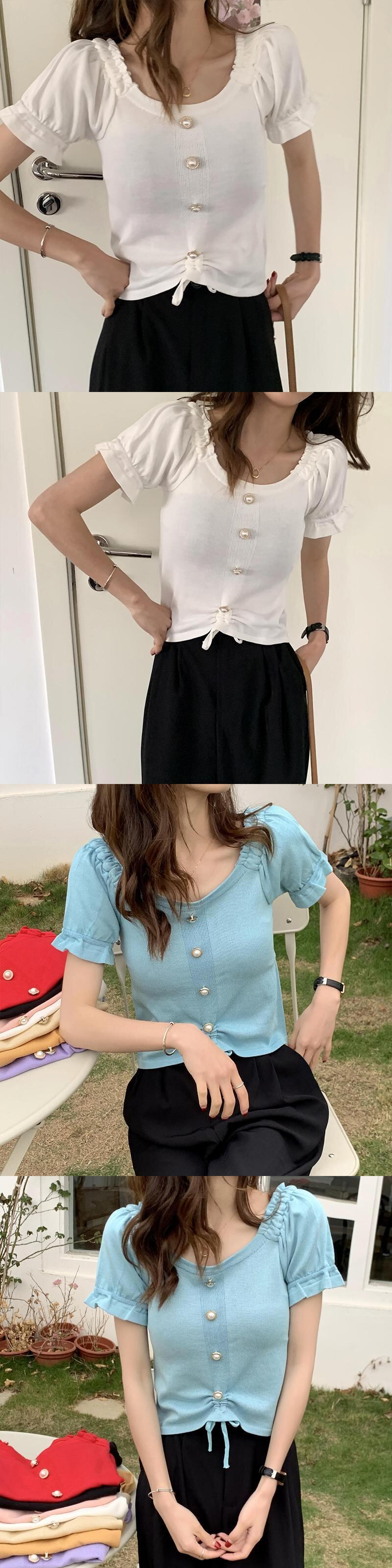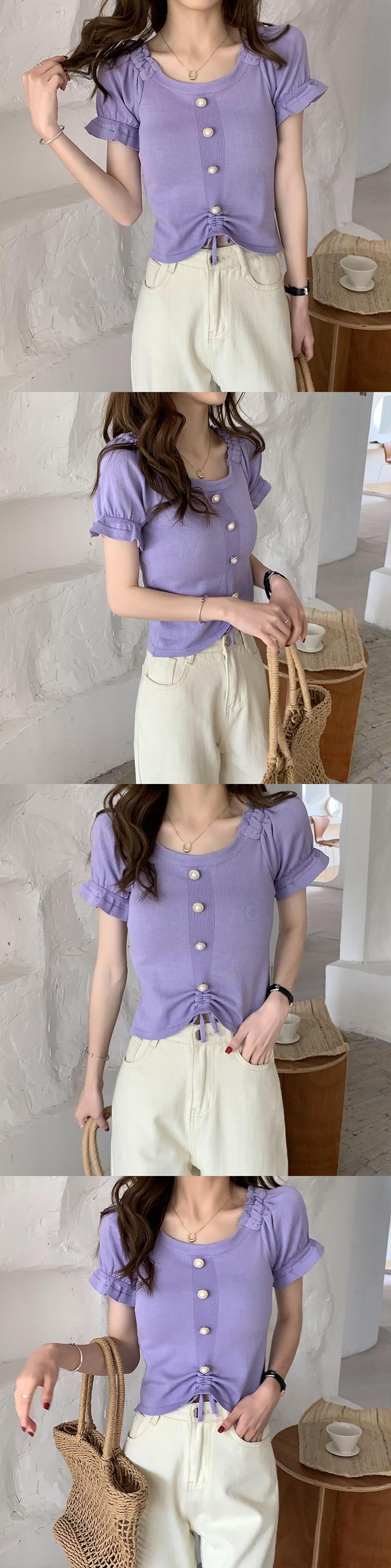 ホワイトショートトップス ギャザー半袖スリーブニットTシャツ ハーフスリーブ クレセントシティ64519820058