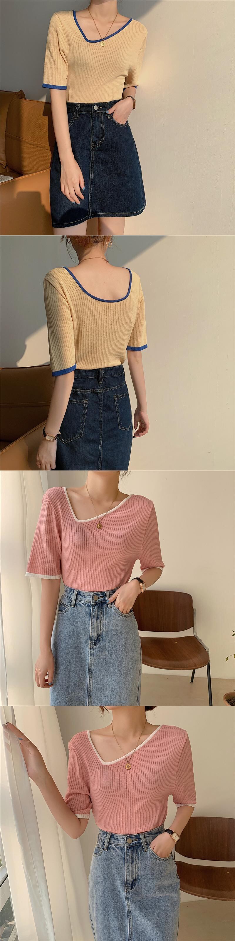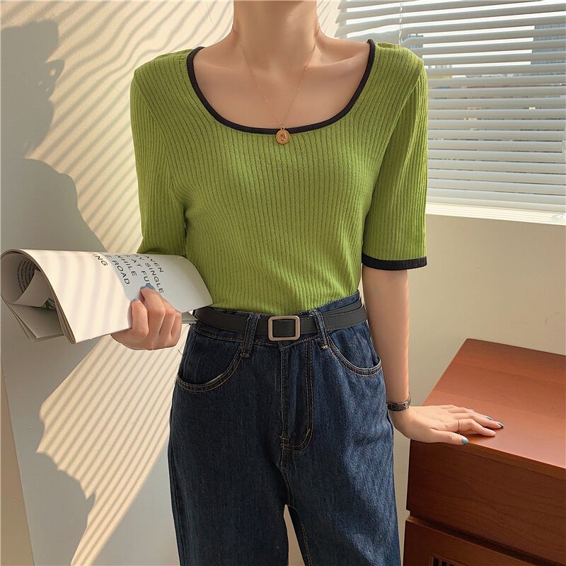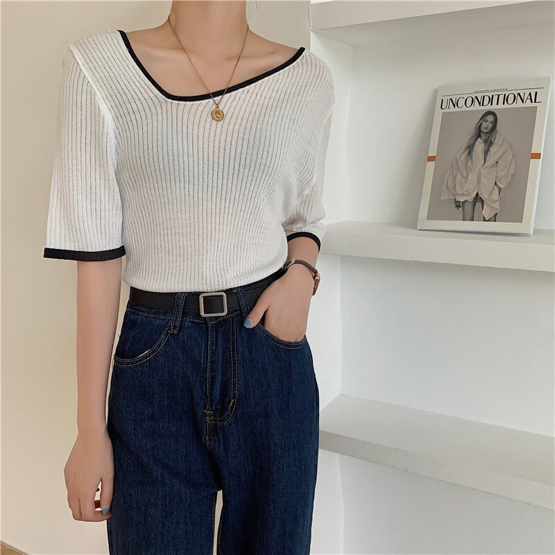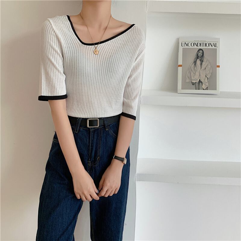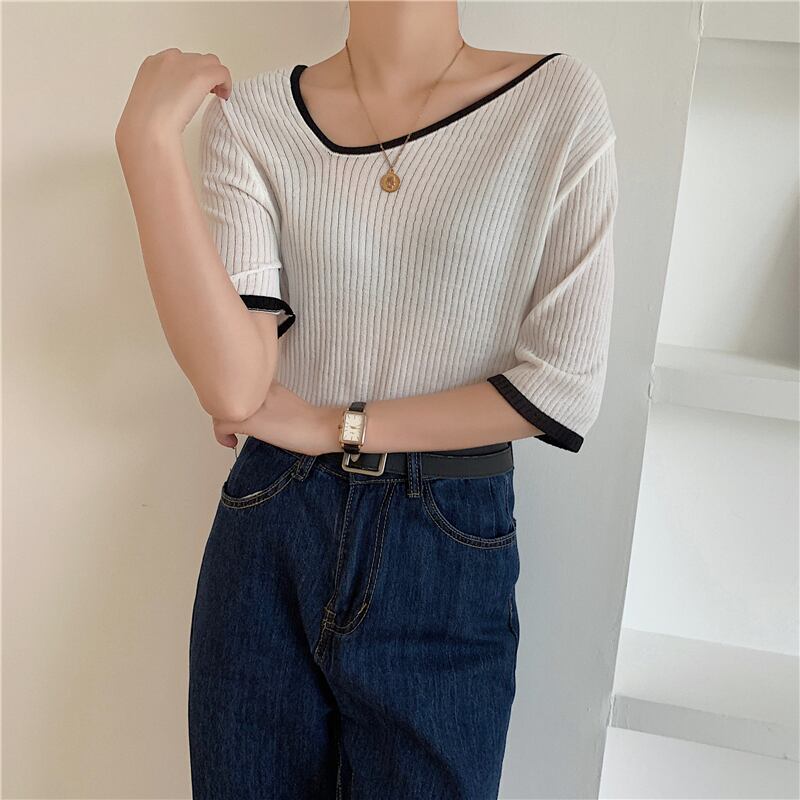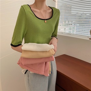 VネックニットショートTシャツ レディースサマースリム薄手トップス 夏物 クレセントシティ65241116010