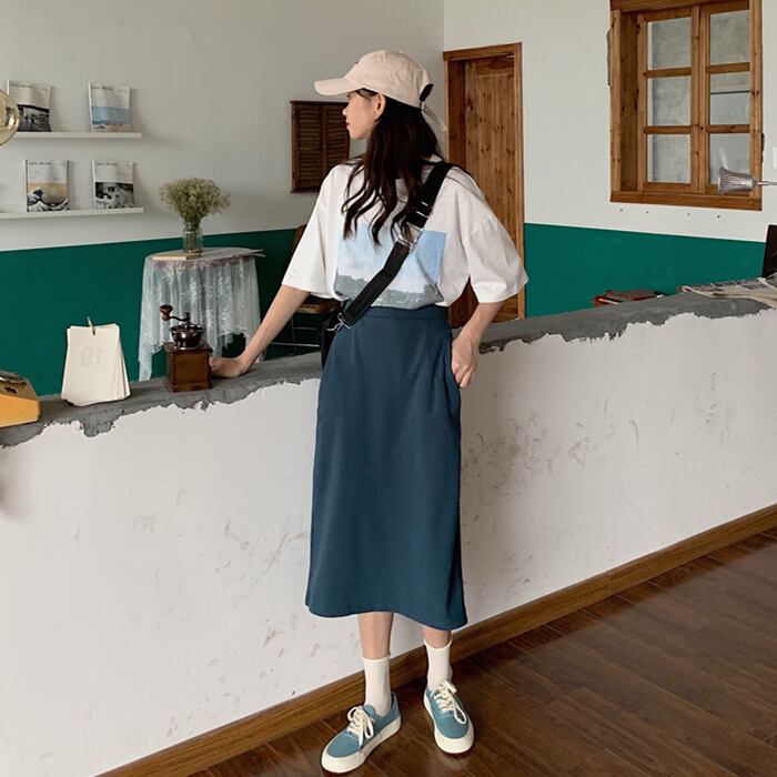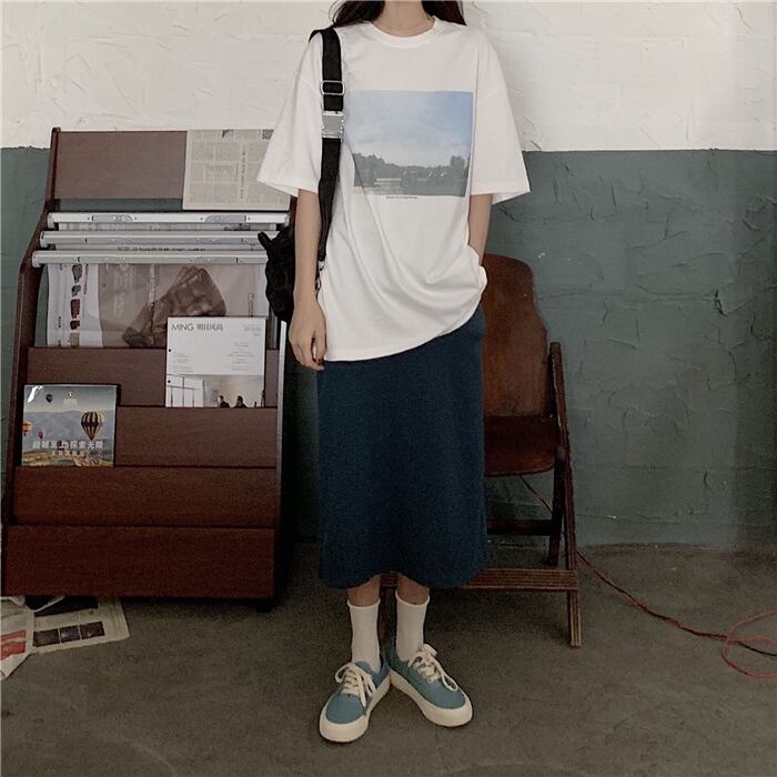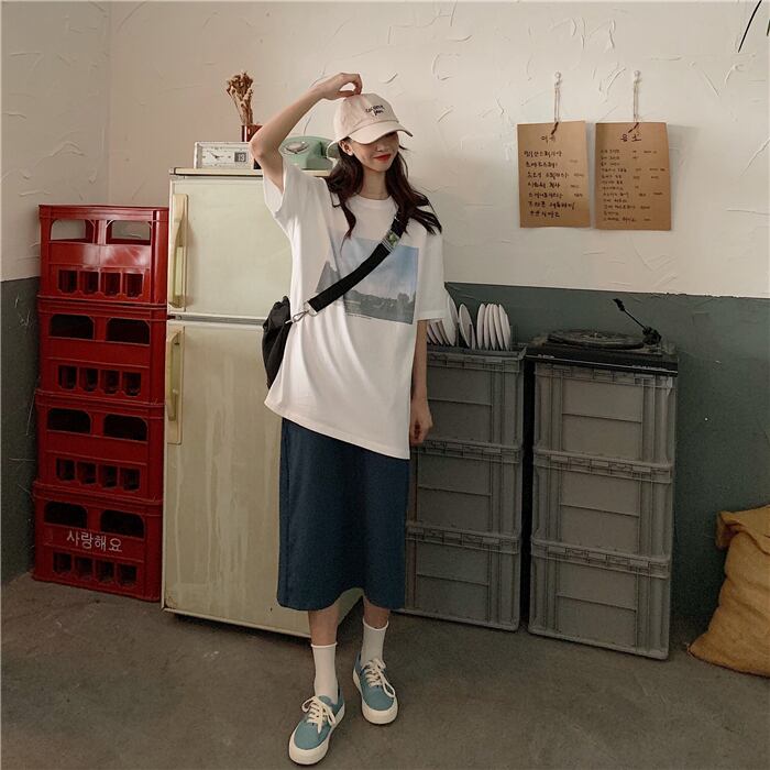 サマーカジュアルルーズプリントTシャツ ストレッチウェストAラインスカート エラスティック 伸縮 夏物 クレセントシティ72397180185