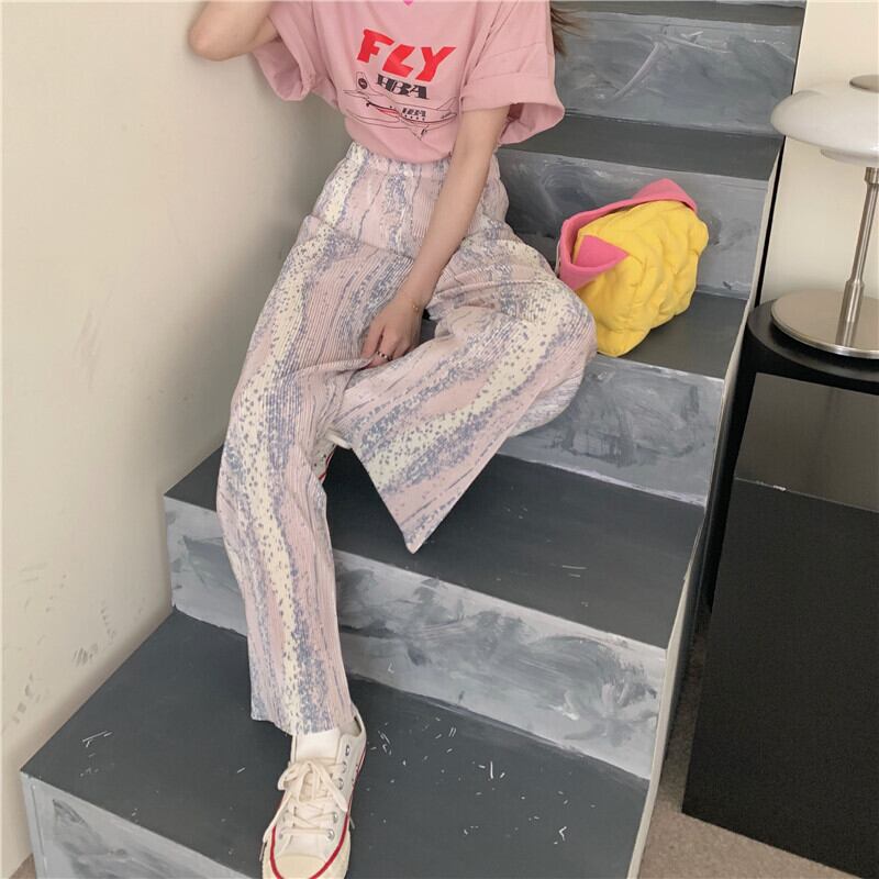 サマープリントTシャツ ルーズハイウェストウェストカジュアルパンツ ピンク 夏物 クレセントシティ75194606288