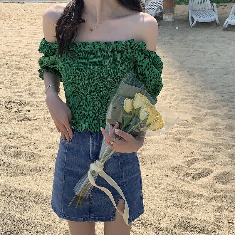 色:緑のシャツ,ロイヤルブルーデニムスカート