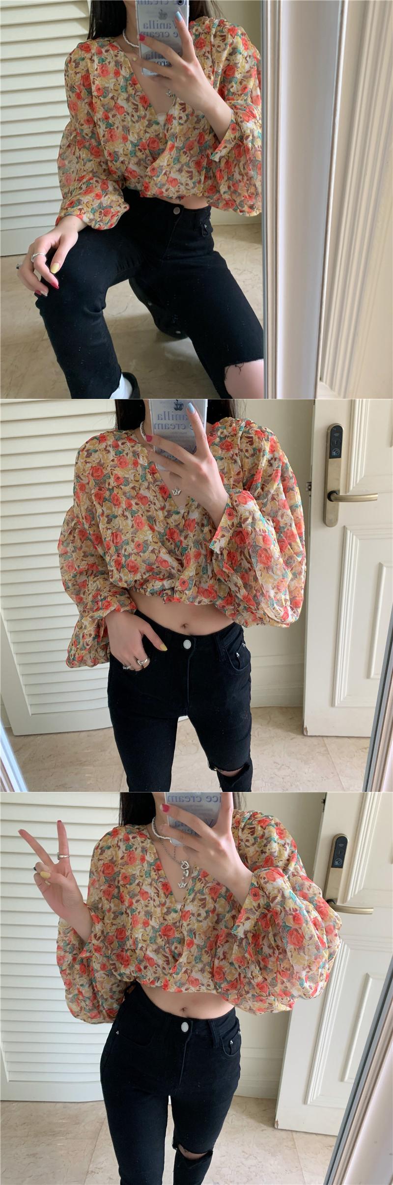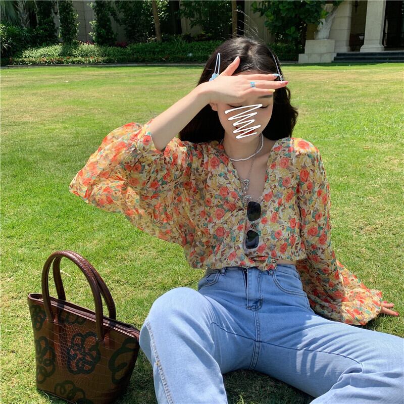 フローラルスリーブシフォンシャツ サマーVネックショート ランタンスリーブ 大人ガーリー スウィート キュート カジュアル 夏物 花柄 クレセントシティ78375572609