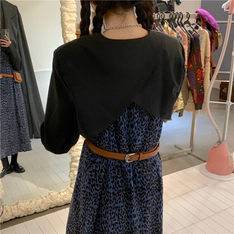 スプリングショートブラックジャケット ロングレオパードプリント柄スカート レッド 春物 クレセントシティ68726110144
