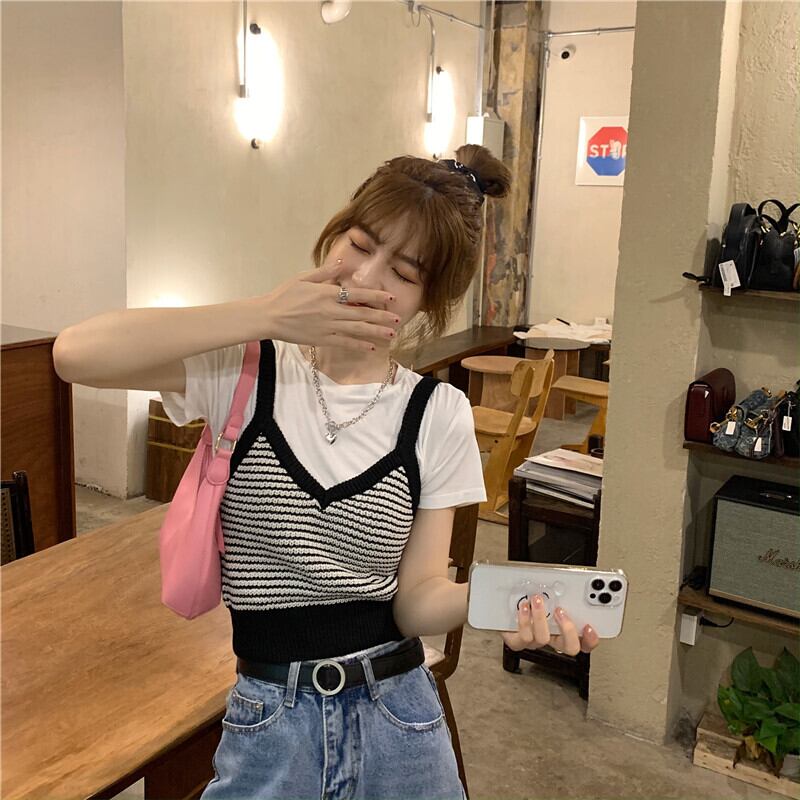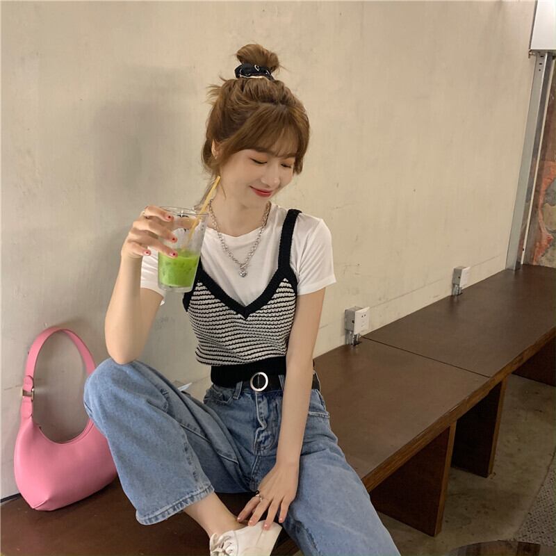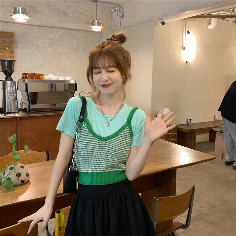 カラーニットVネックウェストショートソリッド Tシャツ ソリッドカラー クレセントシティ41731542067