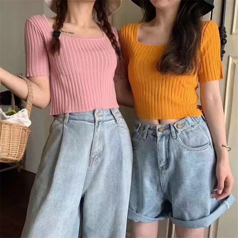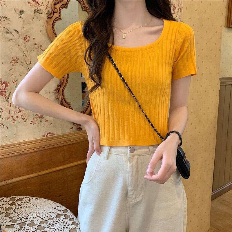 Tシャツ サマーカラースリムショートソリッド セーター トップス 夏物 シルク ソリッドカラー スクウェア クレセントシティ54464824439