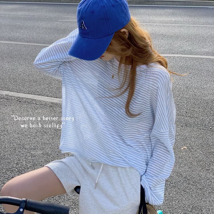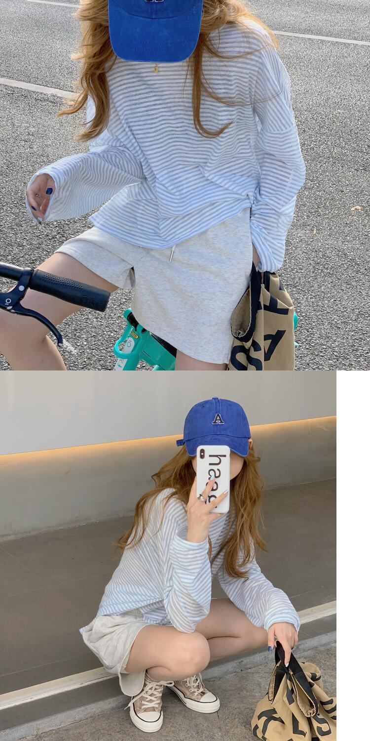 スタイルストライプ薄手Tシャツ ハイウェストウェストカジュアルルーズショーツ ロング ブルマー クレセントシティ26598651354