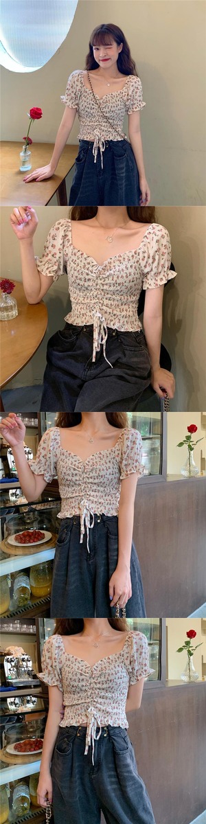 フローラルショートトップス レディースサマースタイルスリムギャザーTシャツ 夏物 花柄 クレセントシティ85782824800