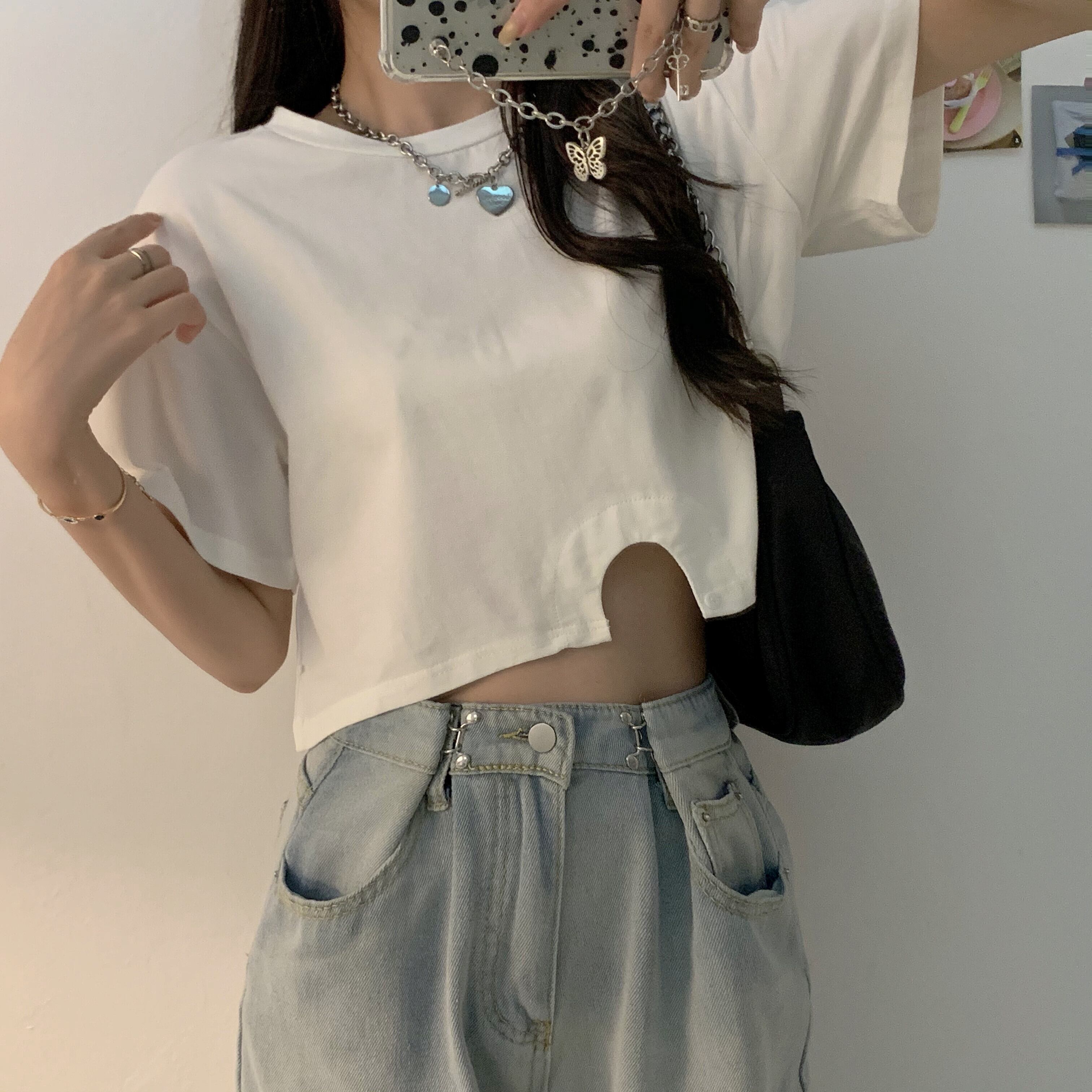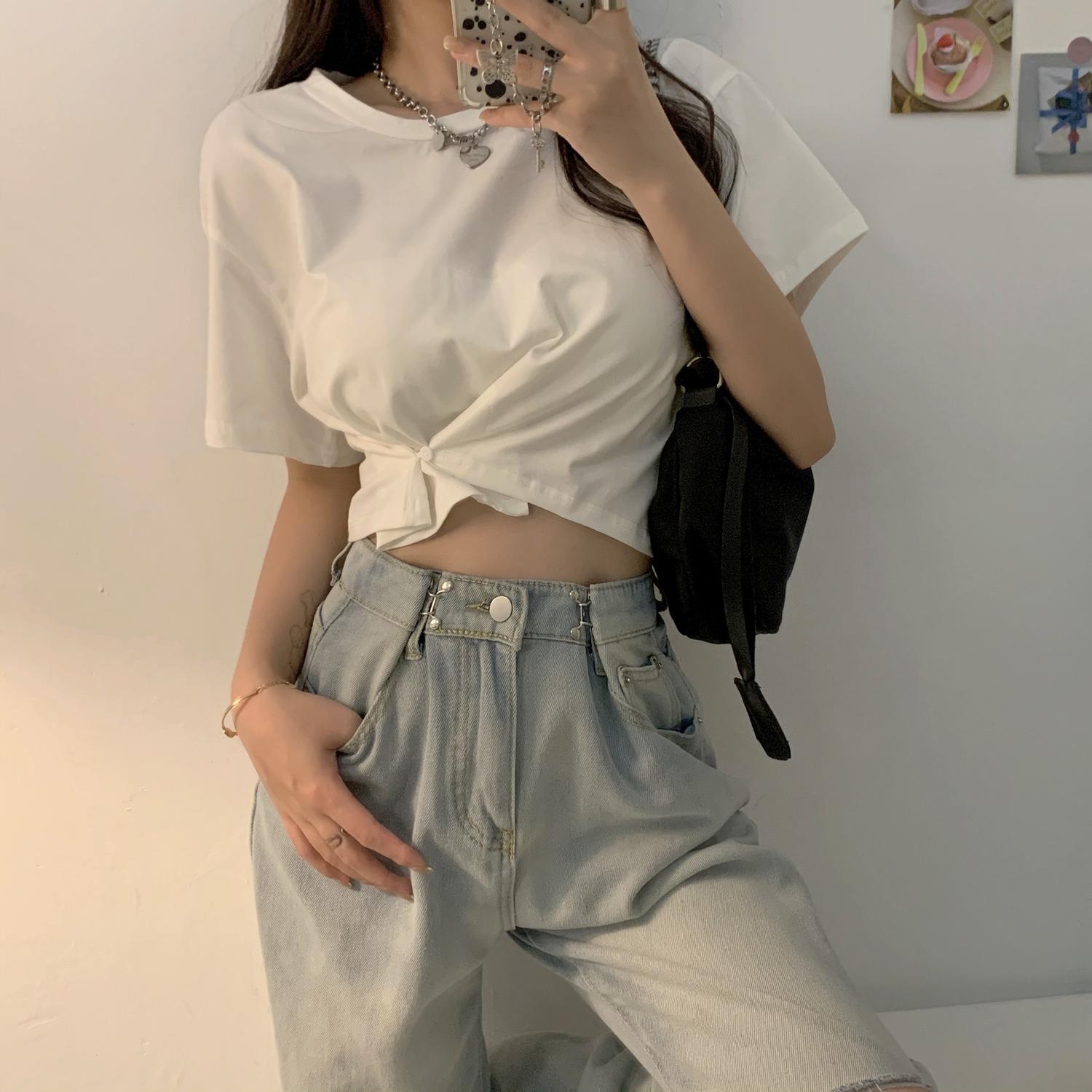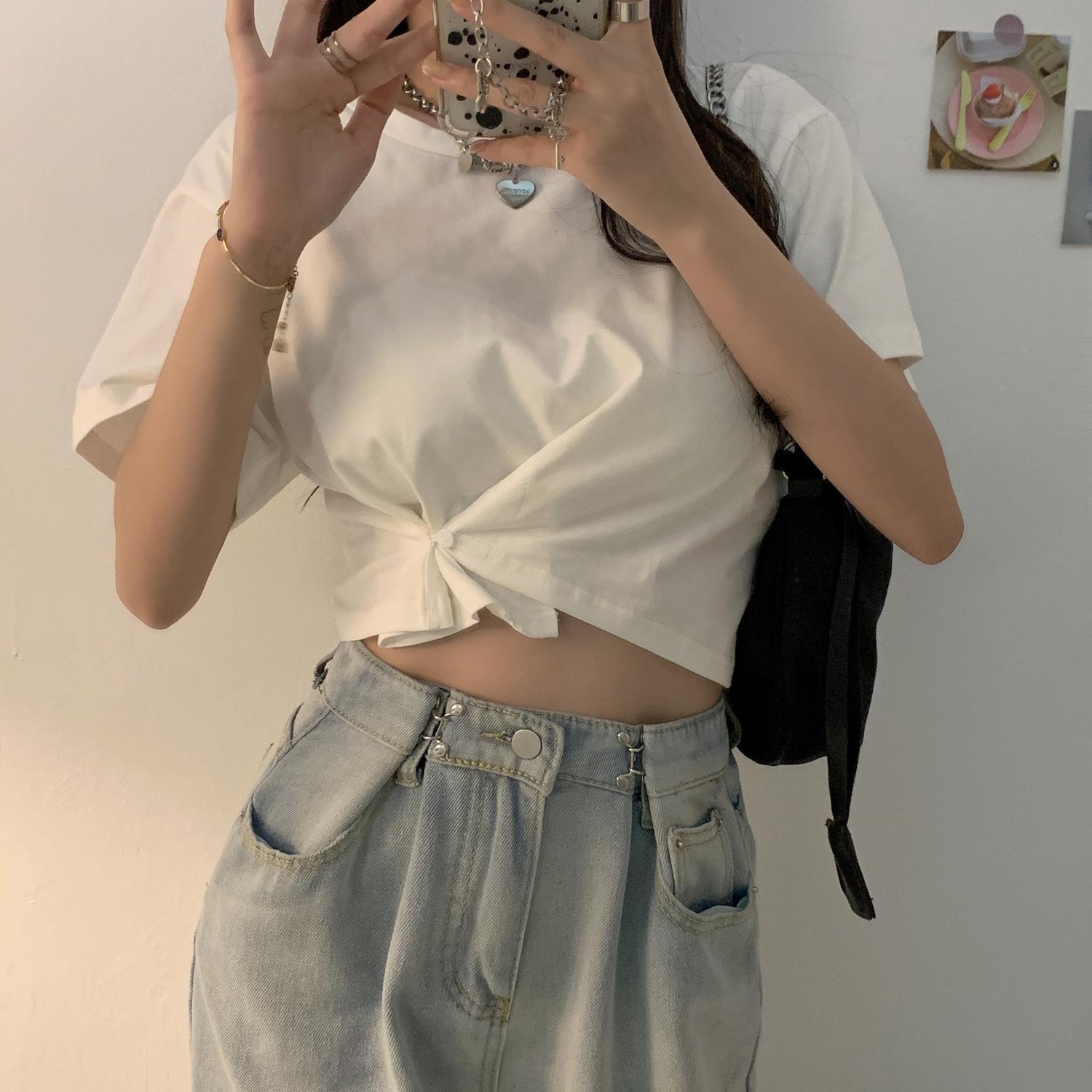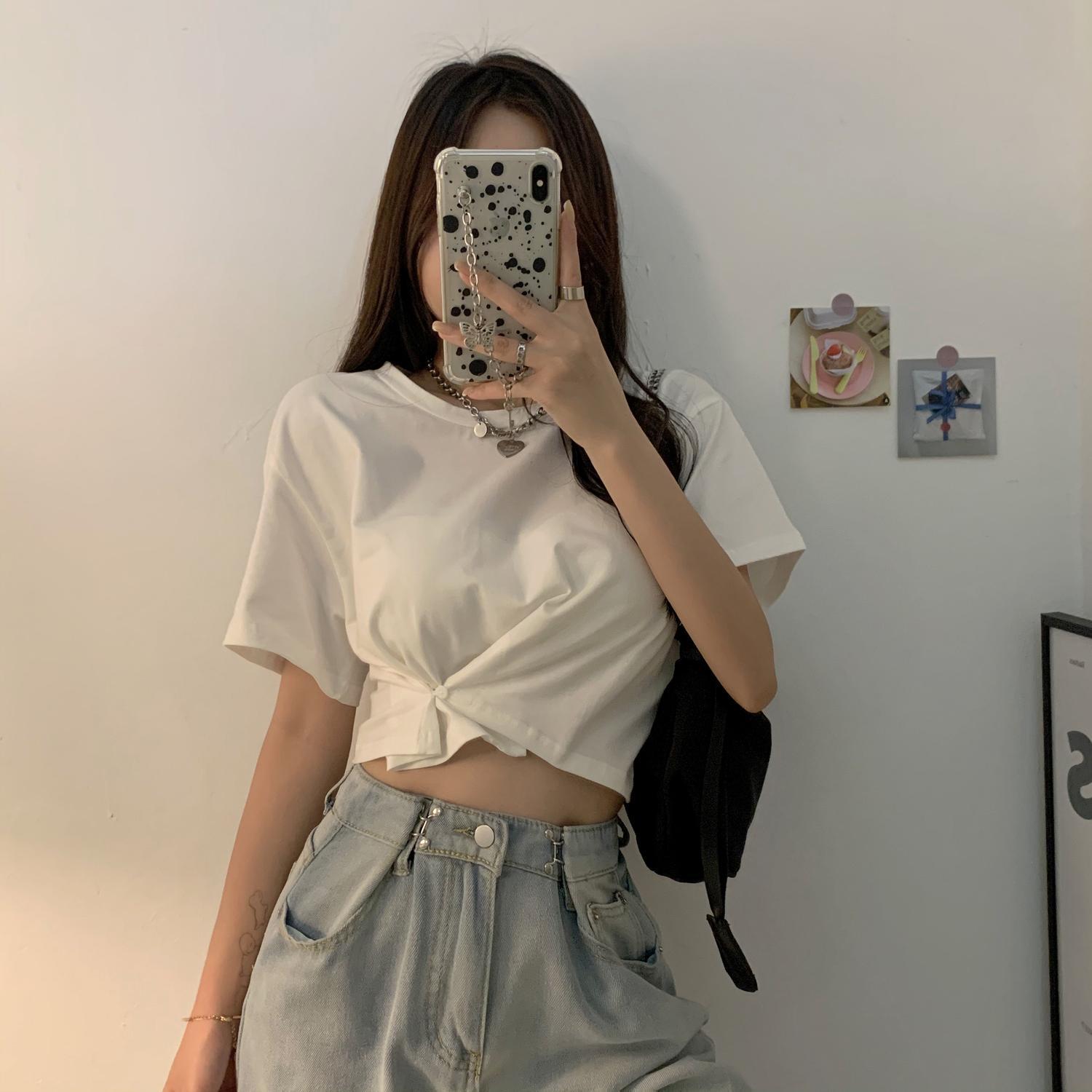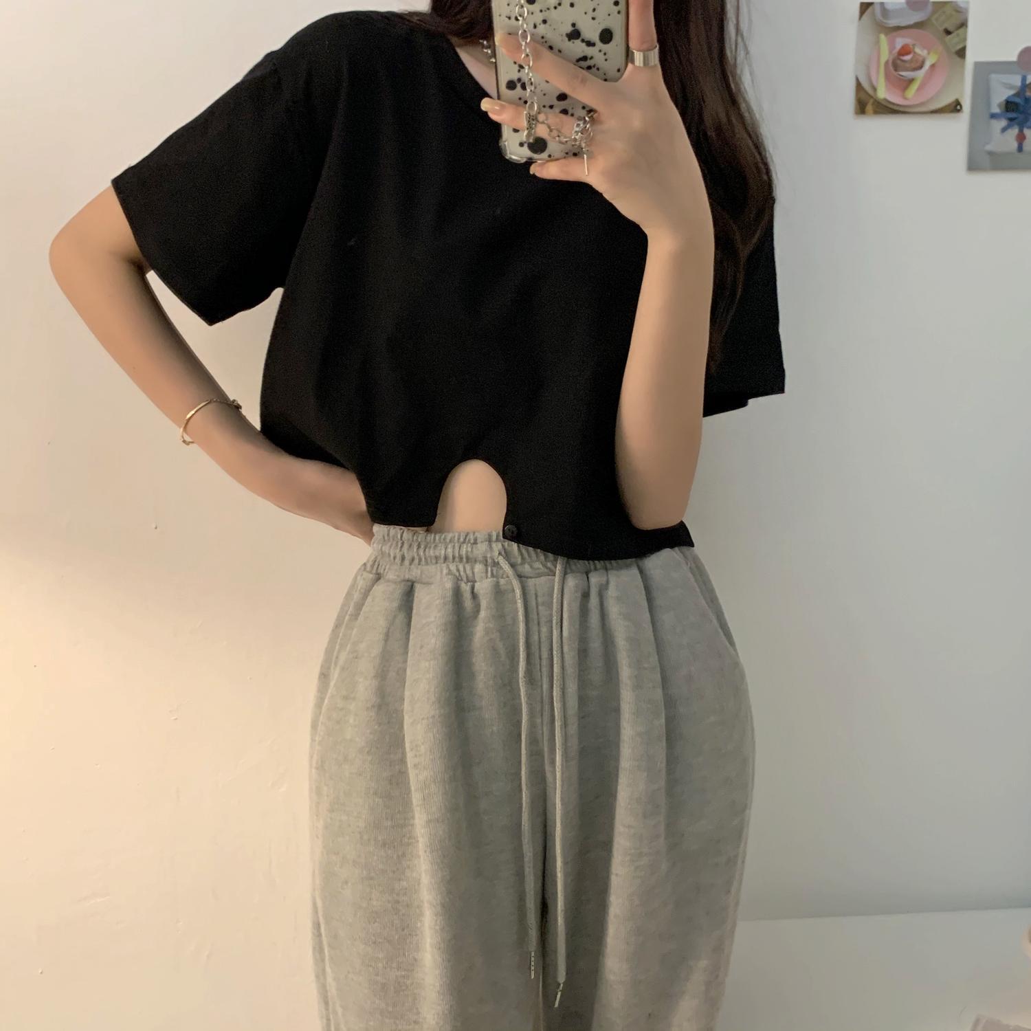 ショートTシャツ サマースタイルルーズ薄手カジュアルハイウェストブラックトップス 夏物 クレセントシティ55218749163